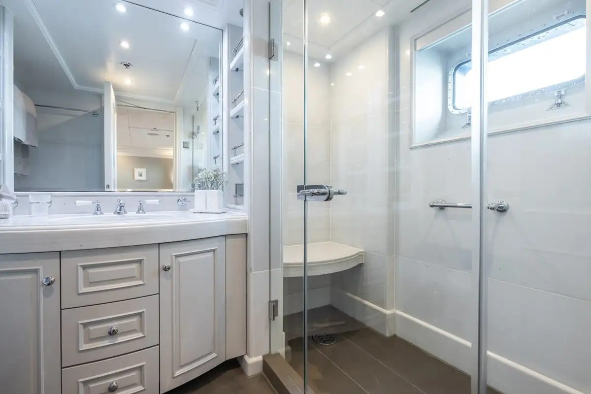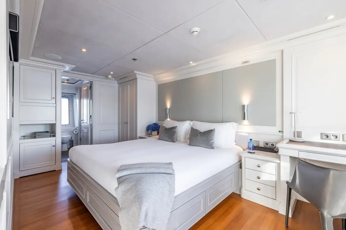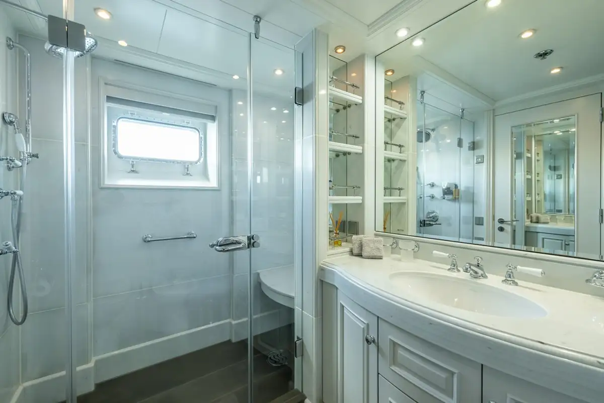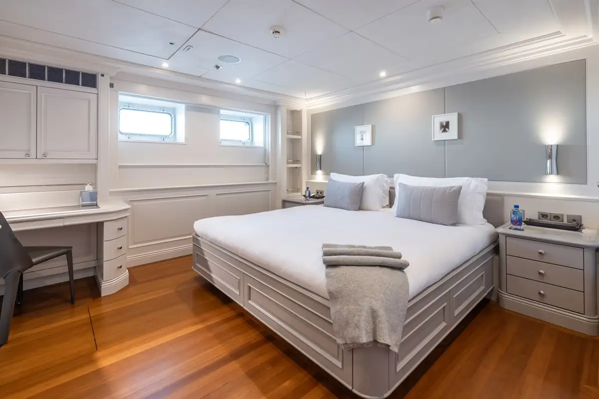 Her total internal volume adds up to 499GT, arranged on three main levels. She is designed to host up to 12 guests in six cabins, with separate quarters for up to 12 crew. The interior was redesigned and extensively refurbished in 2015-2016, with a palette of pale grey and off white, and about 200 square metres of Burma teak flooring.