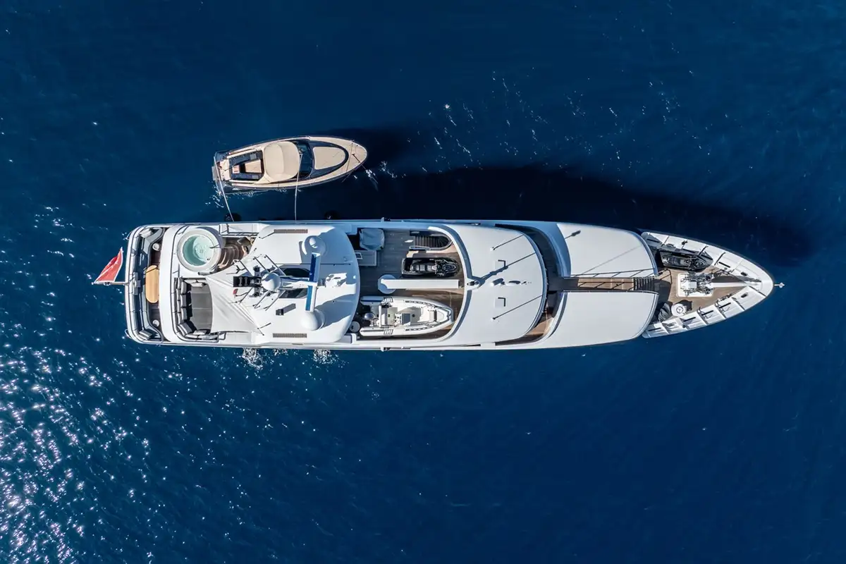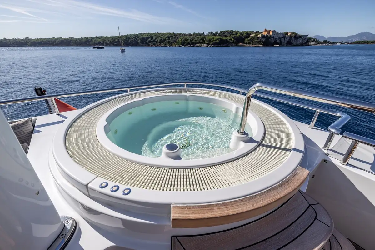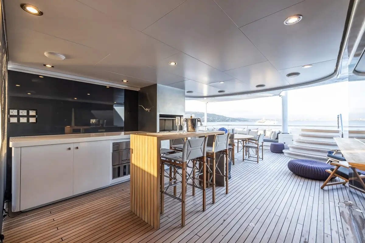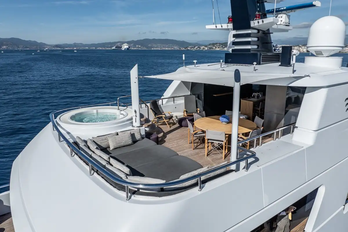 She has a large sundeck with an enclosed lounge amidships, a jacuzzi and sunpads aft and dedicated stowage for small craft forward. Her other exterior features include aft decks and covered companionways on the main and bridge levels, and a functional Portuguese bridge with a walkway leading to the foredeck.