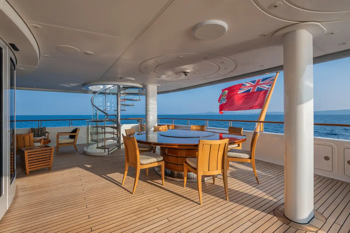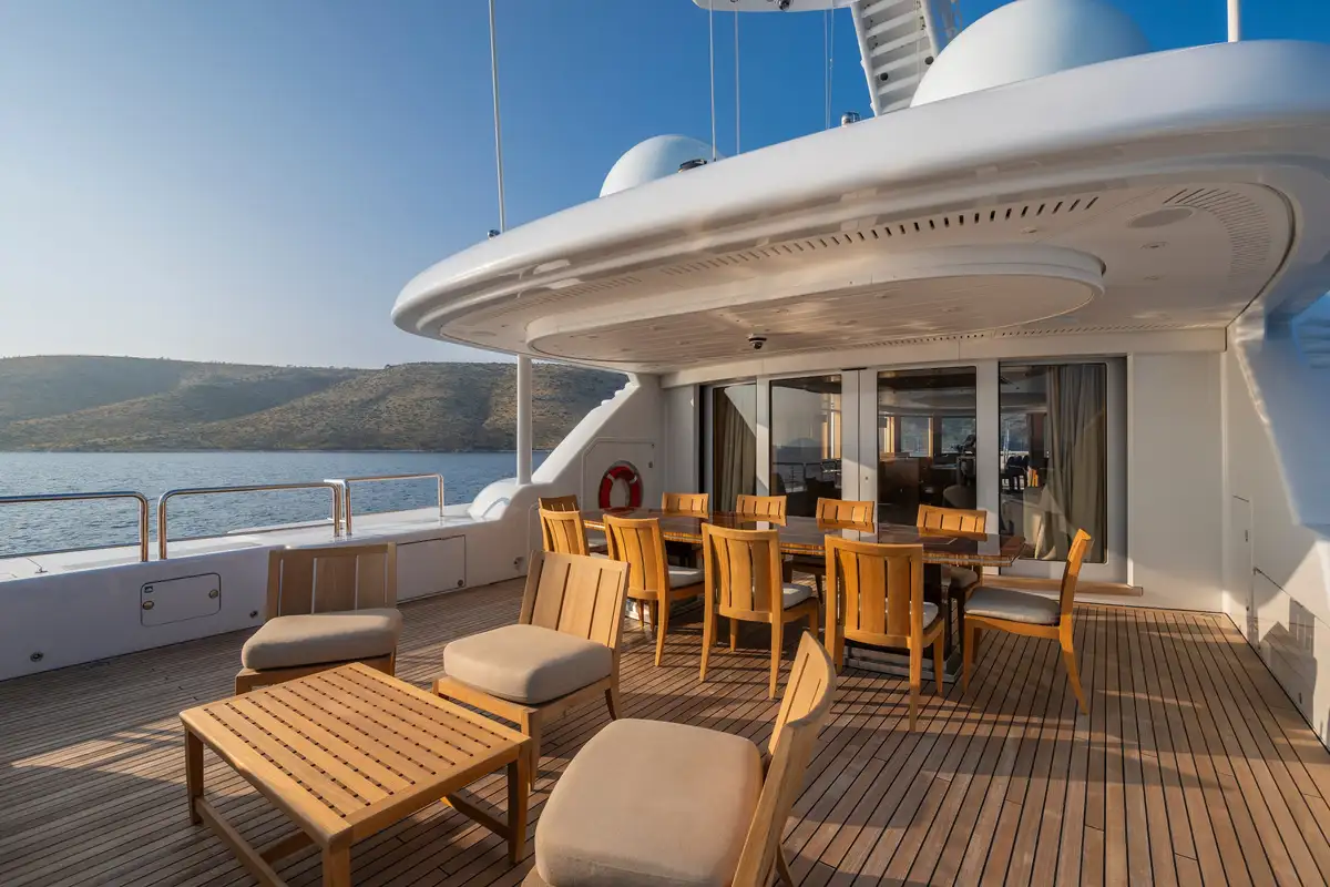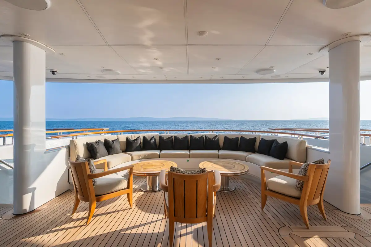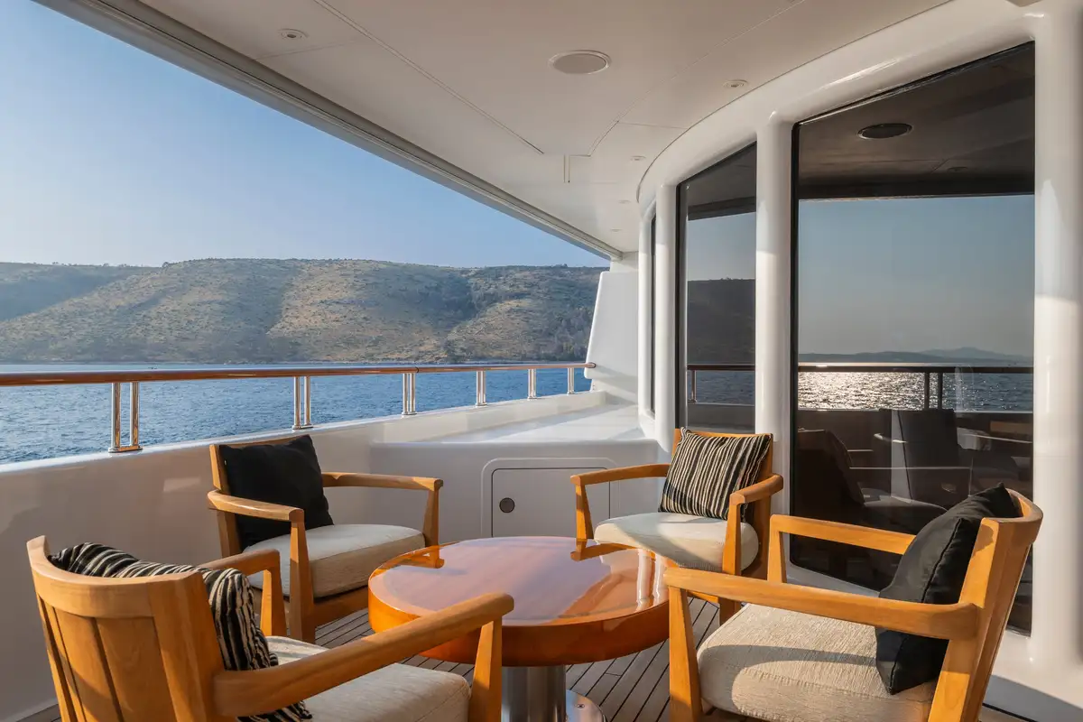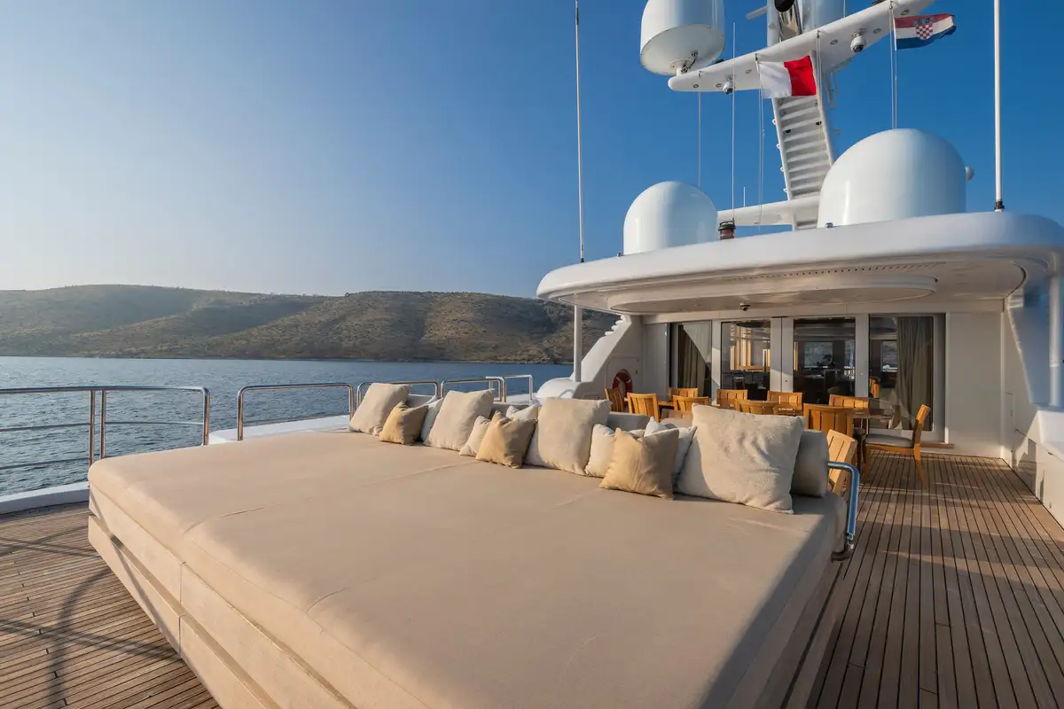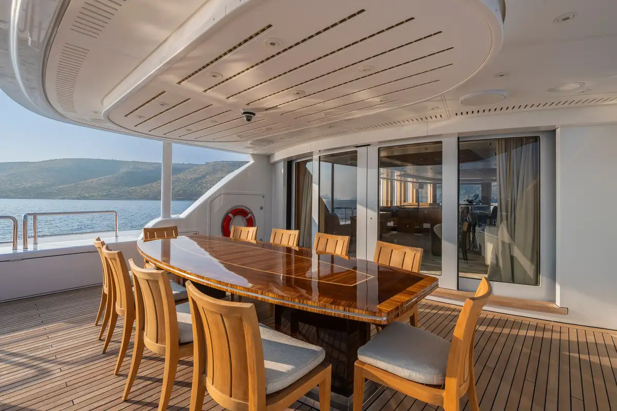Her versatile interior includes a formal lounge that can be converted to a cinema via a hidden screen and projector, ideal for relaxing evenings or movie nights on board.