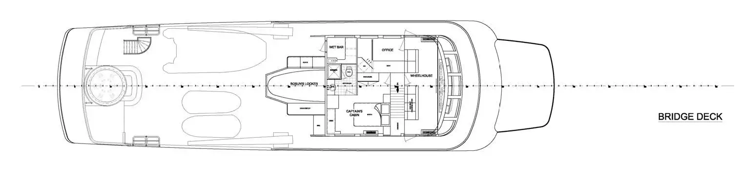 The Bridge deck on CALYPSO is designed for al fresco entertainment and a favorite spot for guests to gather. This area features an all-new hot tub surrounded with lounge pads, a projector with a 120-inch screen, a BBQ and a wet bar.
