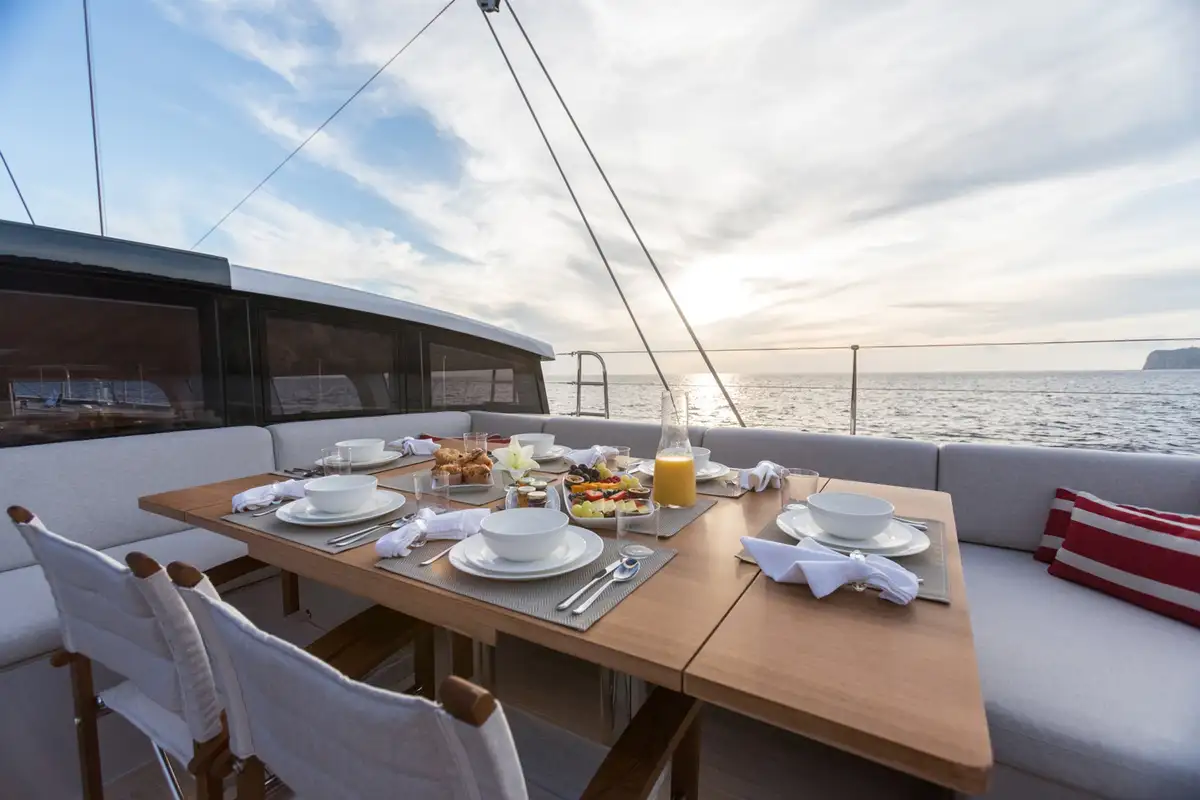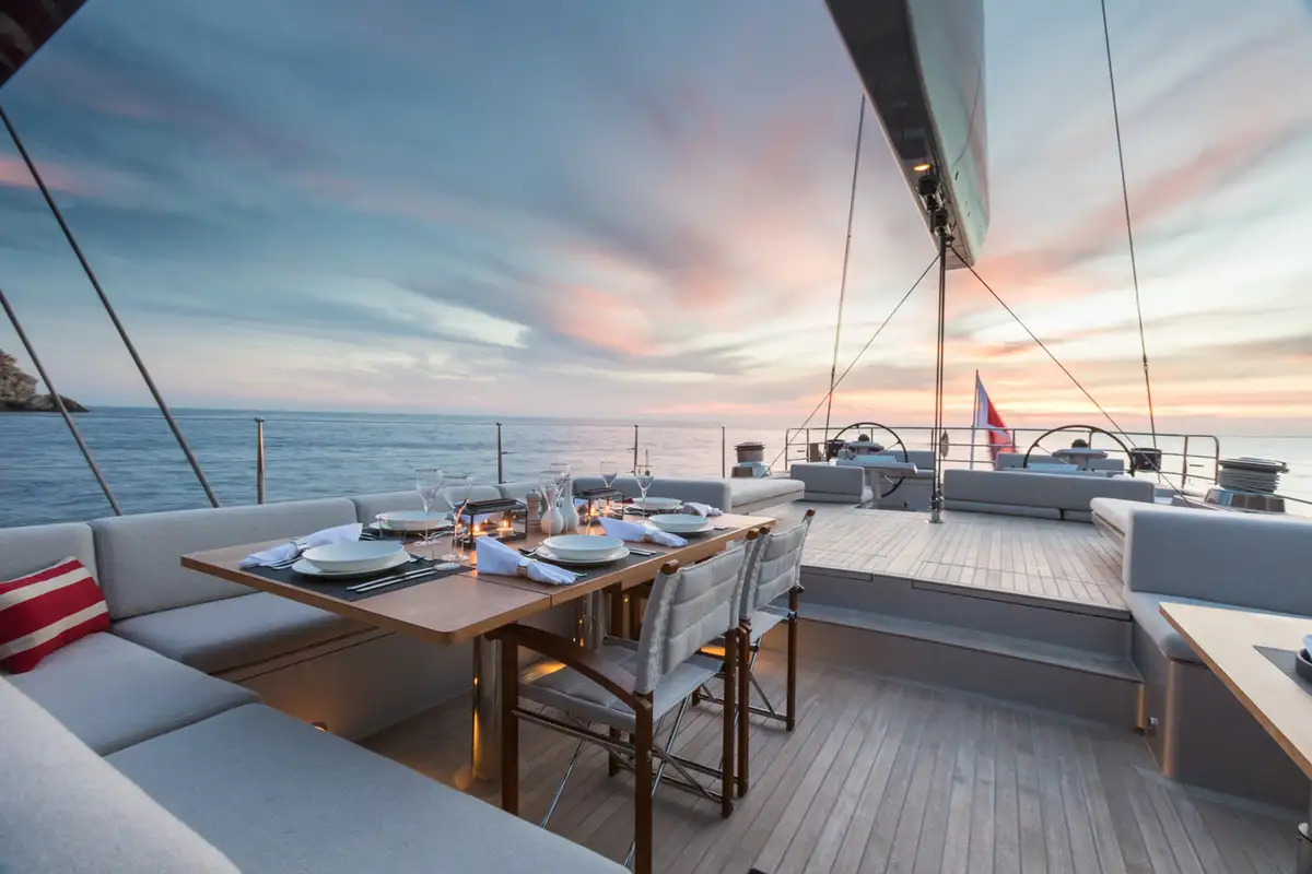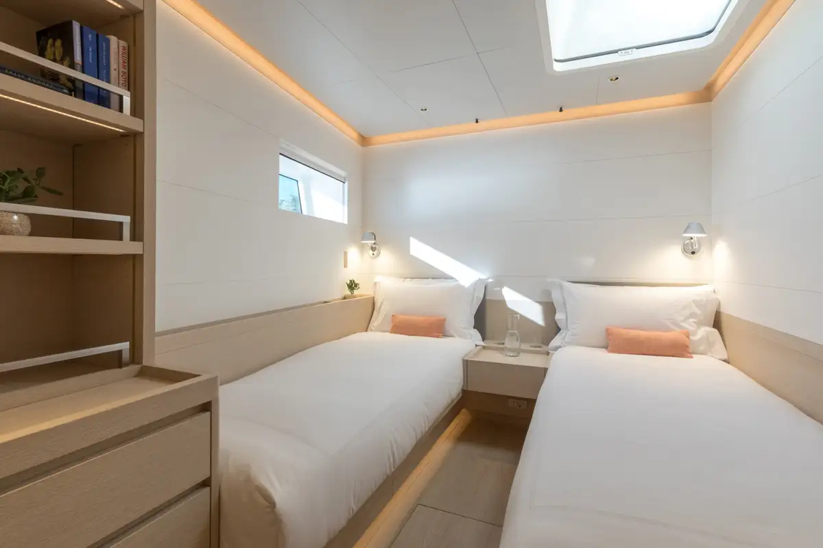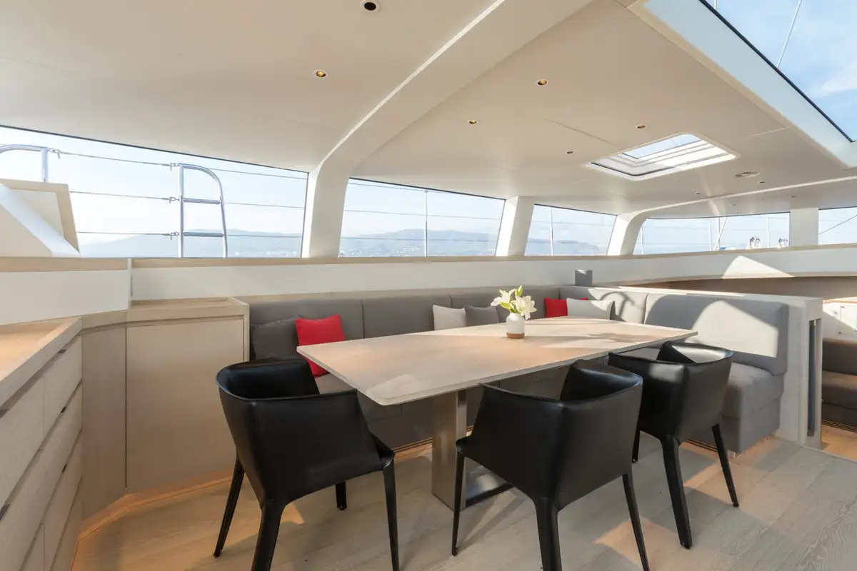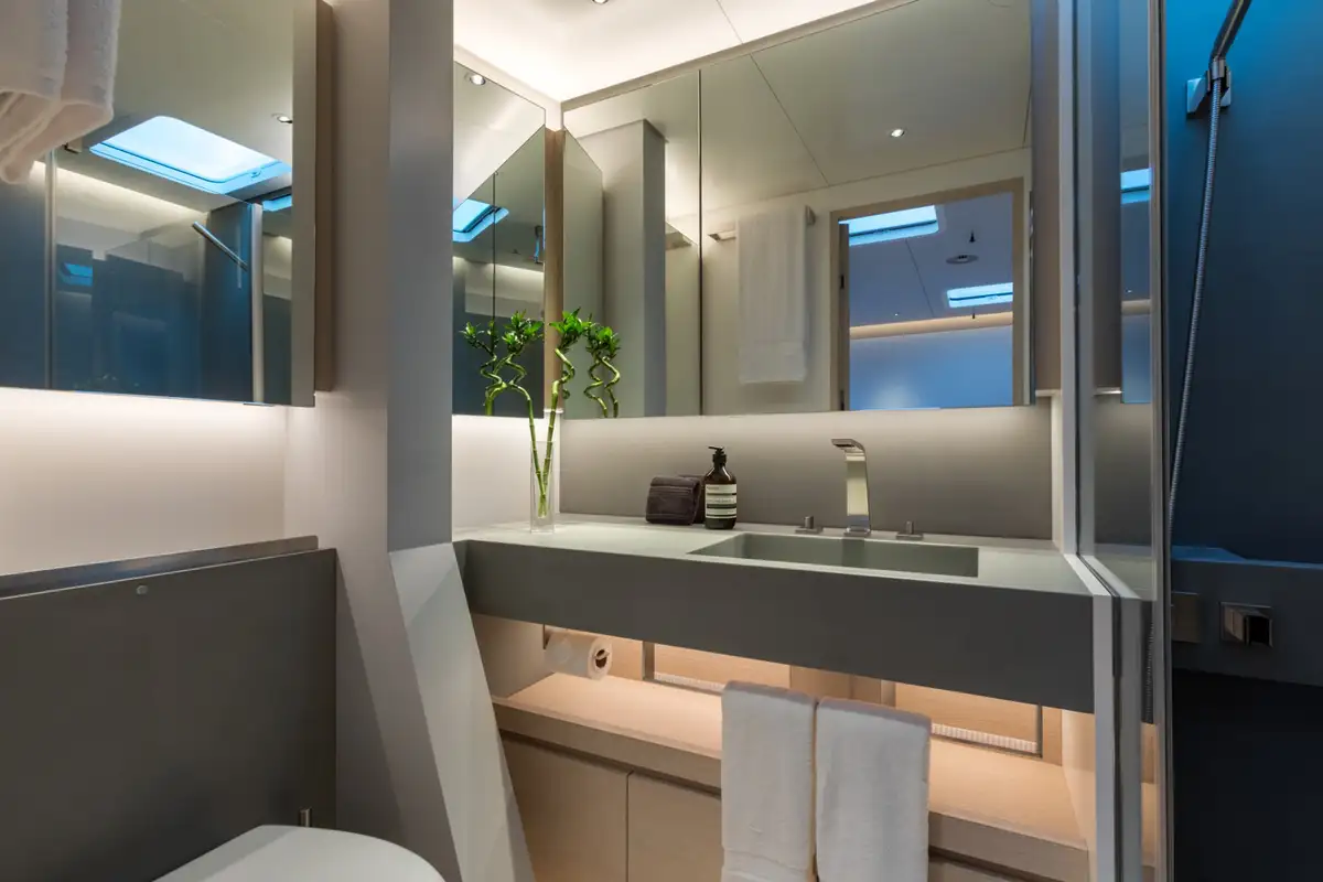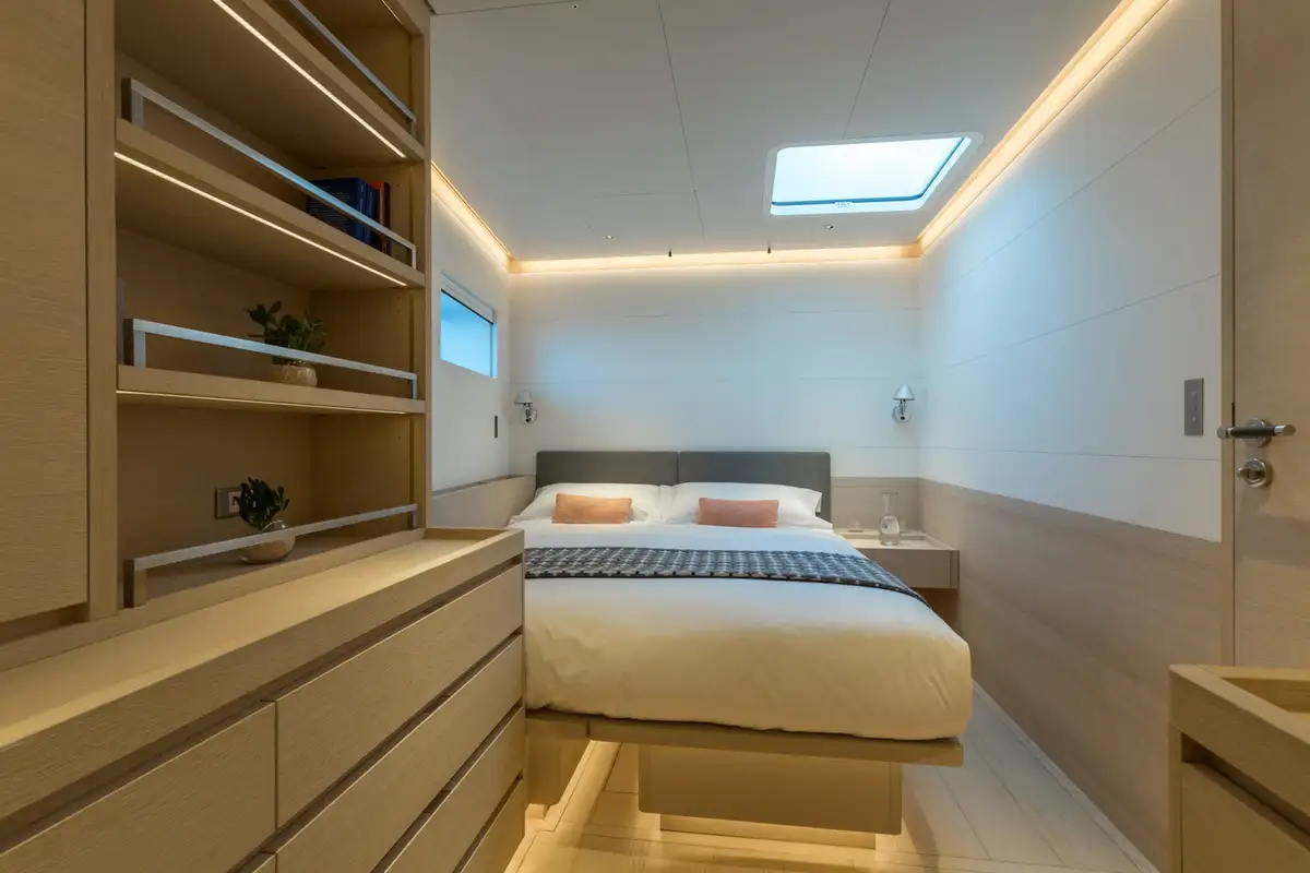 She can accommodate eight guests in four cabins. Her interior styling is focused on enhancing this minimalist design, with natural woods and a calming ambiance that blends seamlessly with the updated exterior profile.