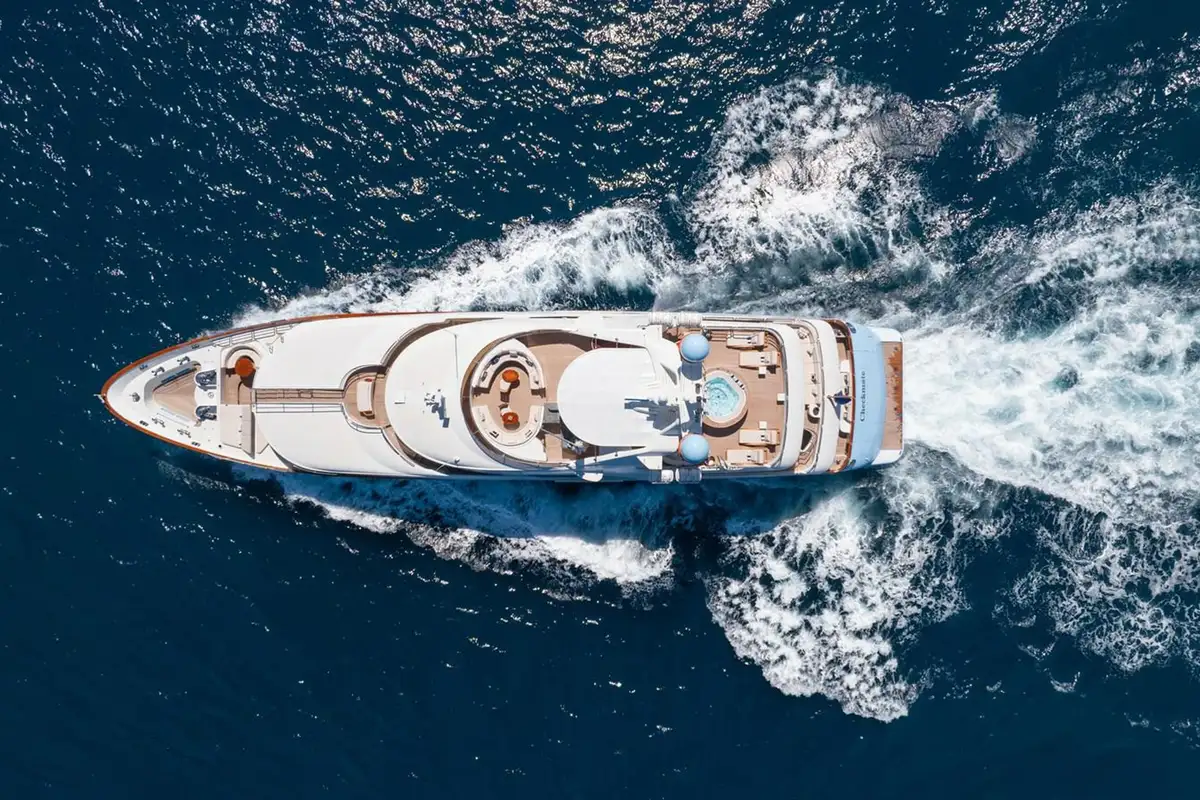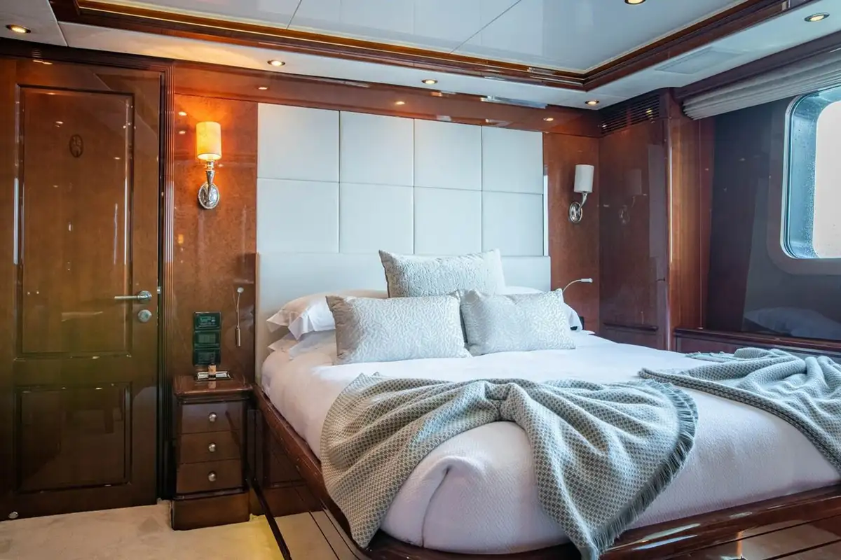 Her top speed is 15 knots, her cruising speed is 13 knots, and she boasts a maximum cruising range of 3,500nm at 12 knots, with power coming from the twin Caterpillar diesel engines. She can accommodate up to 12 guests in five cabins, with 10 crew members. Compared to similar size yachts, her volume of 75.49 GT is above the average.