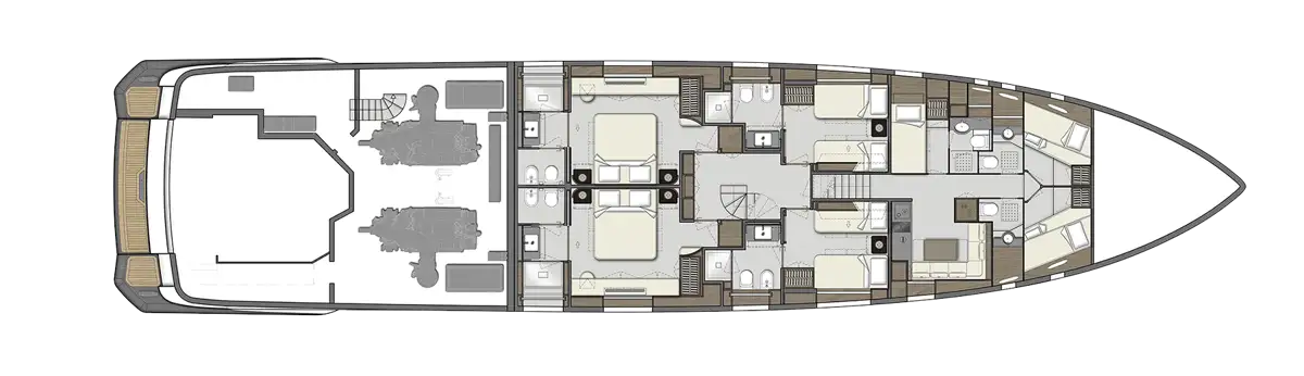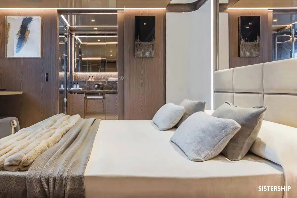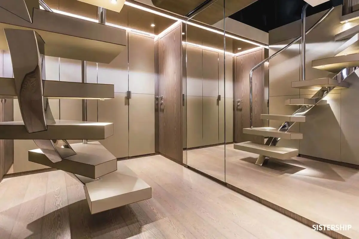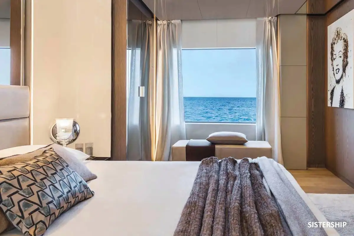She can accommodate 10 guests in five cabins. The guest accommodation is on the lower and main deck. On the lower deck, there are two double VIP suites, each with outboard-facing berths and en suite heads with large separate shower compartments. Forward are two twin-berth cabins, each with en suite heads and a shower. Forward of the guest accommodation is the crew mess and accommodation. On the main deck, the full-beam owner's suite is forward. It has a full-beam his and hers en suite heads, forward, with a large, shared shower compartment. To starboard the suite has a fold-down balcony, aft is a dressing room. Abaft of the owner's suite are the galley, day heads, and entrance foyer. In the saloon, the formal dining area is forward. Aft is L-shaped sofa seating.
