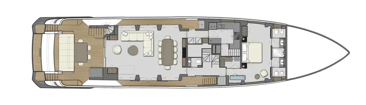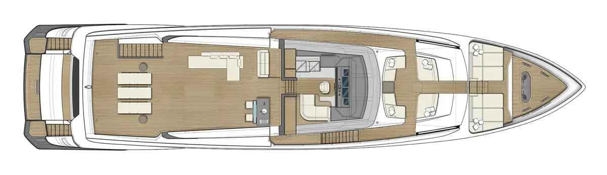 CL106 has an upper deck that incorporates a flybridge and can be accessed from the raised wheelhouse. Forward, on the flybridge, is the exterior helm to port and a wet bar area to starboard. There is L-shaped sofa seating beneath the shade of the hardtop, with the option of a formal dining area here too, and to the rear is a sun lounger area. The port side deck leads to a Portuguese bridge lounge area with bench seating hi-lo tables, and sunpads. A walkway forward leads to two large sunpads; one on each side. From the forward lounge, steps to starboard lead down to the main deck. On the aft deck, there is sofa seating and access to the swim platform, tender garage and beach club area.