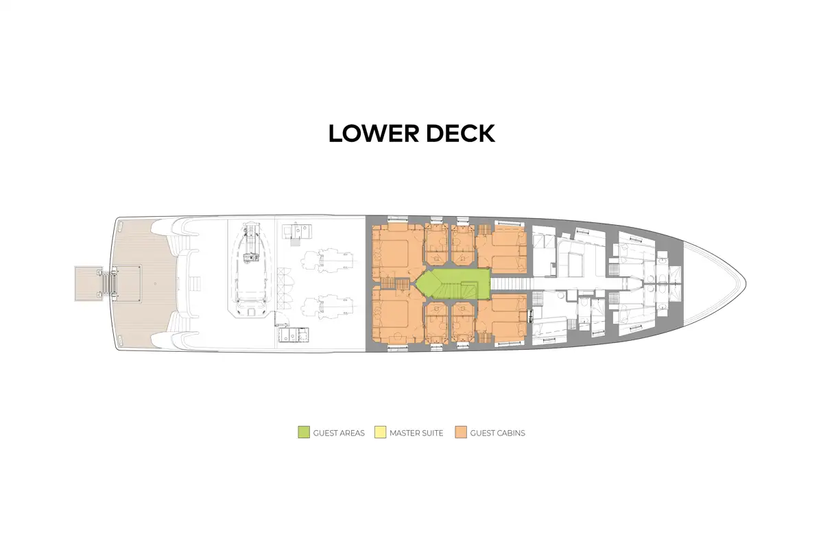 The spacious main deck is home to the large saloon, adjacent formal dining area, a large galley and an impressive master suite with His and Hers bathroom. Outside, main deck aft offers an additional lounge area with stairs leading down to the swimming platform providing easy access to the water.