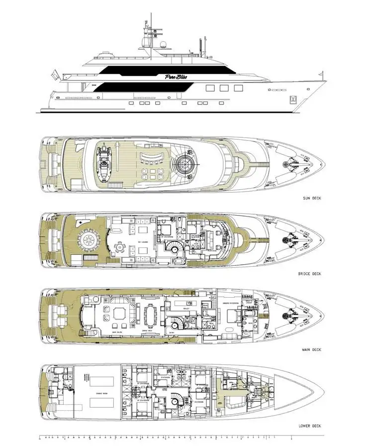 The yacht’s generous deck spaces are designed for relaxation and entertainment. The expansive sun deck features a raised jacuzzi flanked by two captain’s chairs and a large forward sunpad. Aft are a wet bar, casual seating, a sun lounger zone, and exercise equipment. The upper deck offers additional lounging and dining options, including a sunpad to starboard, al fresco dining forward, and relaxed armchair seating aft. Forward of the wheelhouse, a Portuguese bridge provides panoramic views with forward-facing seating and tables. On the main deck aft, guests enjoy another comfortable al fresco dining area with both bench and occasional chair seating.