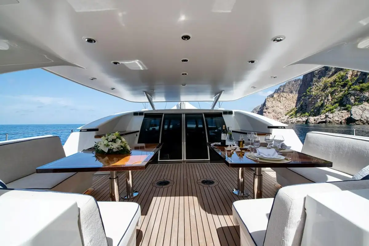 Luxury sailing yacht DAKOTA’s exterior spaces are as impressive as her interior. She features a built-in deck dining salon with a hardtop, ample built-in seating and sunning areas for guests to relax while cruising or while at anchor and a drop-down swim platform that allows for easy water access.
