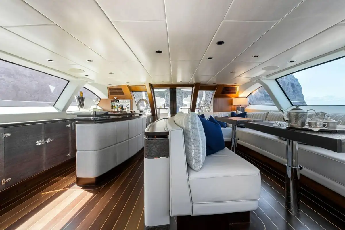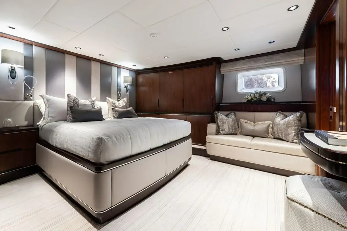 One of her most unique features is her retractable glass sliding doors that, with the push of a button, open to welcome guests into the large interior salon. Satin-varnished English walnut wood sets the tone of sumptuous comfort found throughout the yacht’s interior spaces. A large walnut dining table welcomes all guests for formal indoor meals while surrounded by large windows that allow for nearly 360-degree views. Forward of this space is the yacht’s navigation area, but the push of a button hides away the instrumentation so the space can be used as a buffet. The yacht’s upper salon features a fully outfitted wet bar, ideal for evening cocktails. The yacht’s full-beam lower salon has built-in seating, a sofa, coffee table and large hull portlights that offer impressive sea views. Forward of this space is the recently refitted galley that is fully equipped with all of the culinary equipment needed for a professional yacht chef to create five-star meals.