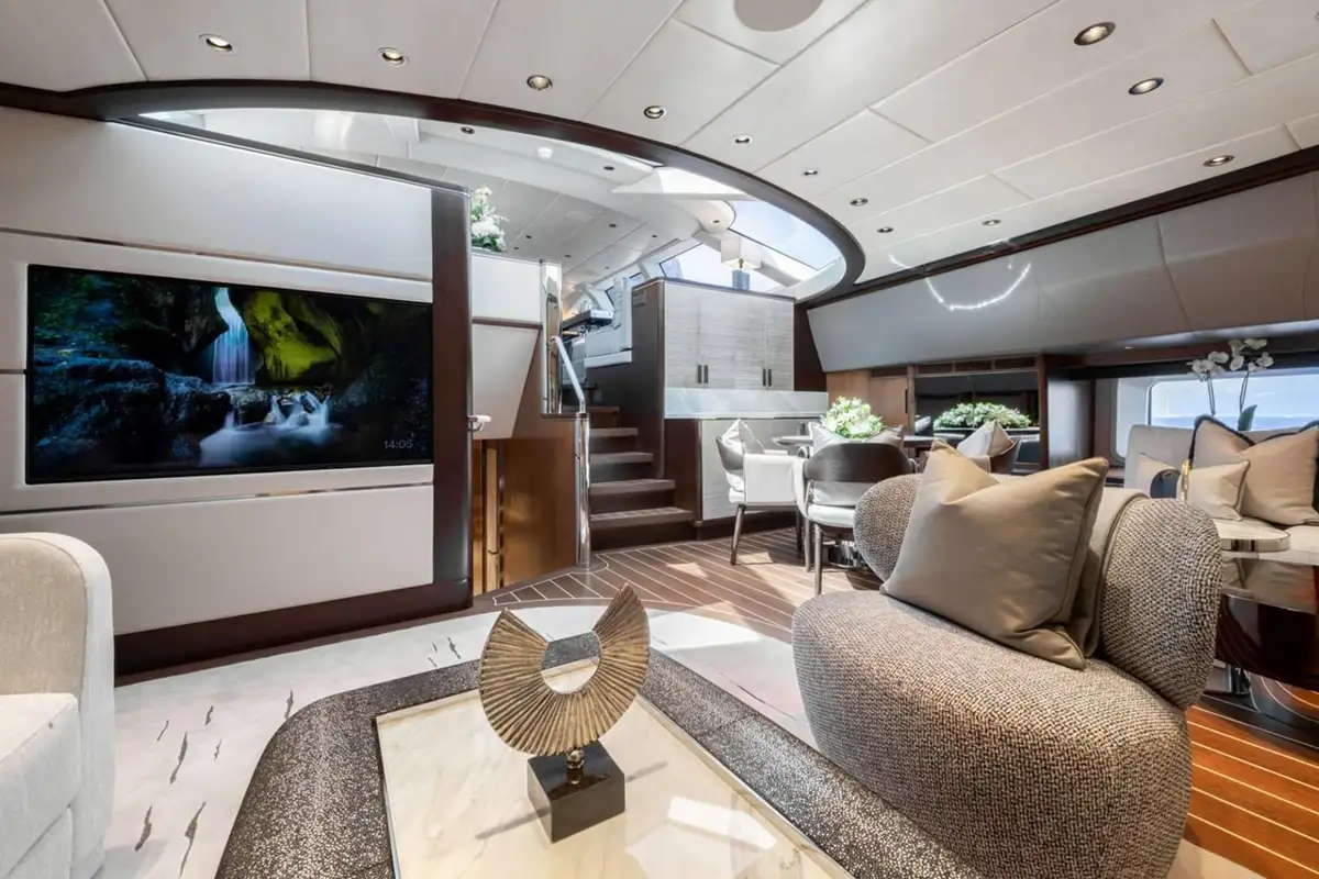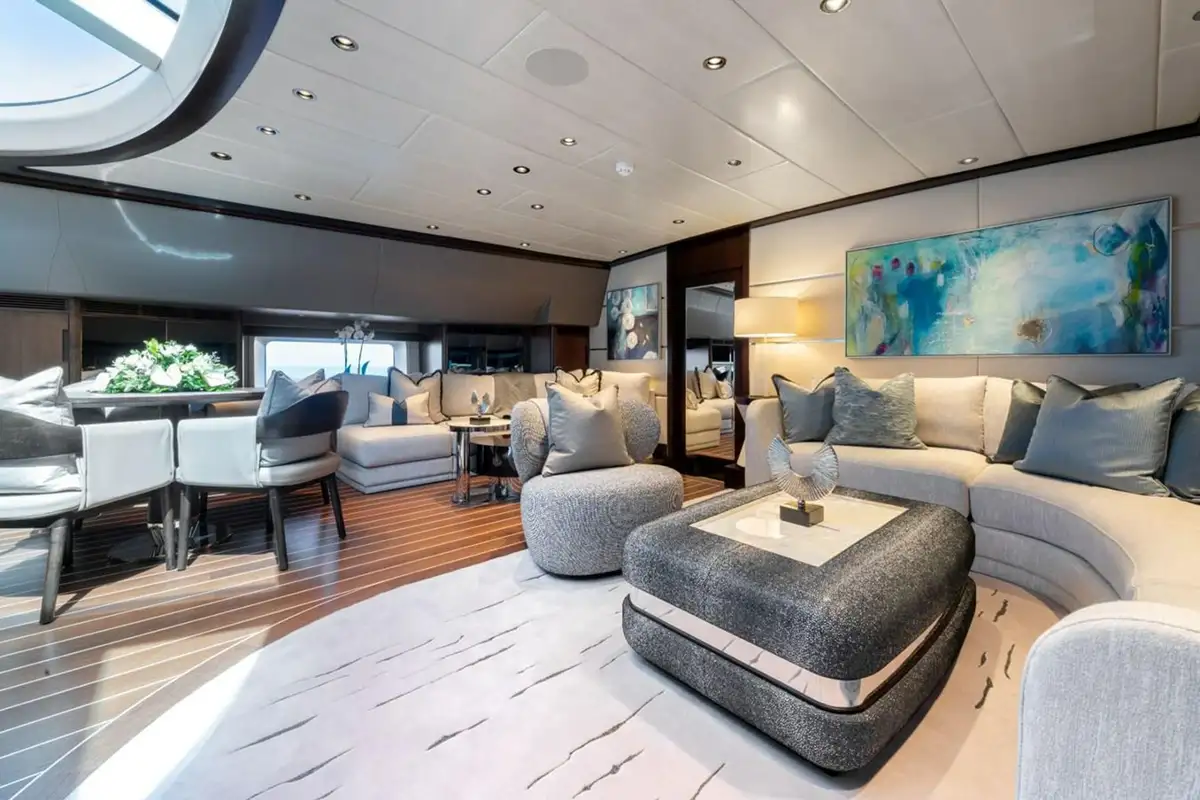 DAKOTA welcomes up to 10 guests in four delightful staterooms. The master suite is located aft and features a king-size bed, a settee, a vanity, full-length closets and a large en-suite bathroom. The VIP has a queen-size bed, a sofa, desk and an en-suite bathroom. Two additional staterooms offer twin and double berths, one with a Pullman. Both have en-suite bathrooms. All staterooms and a day head located on this deck, are accessed from the lower salon.