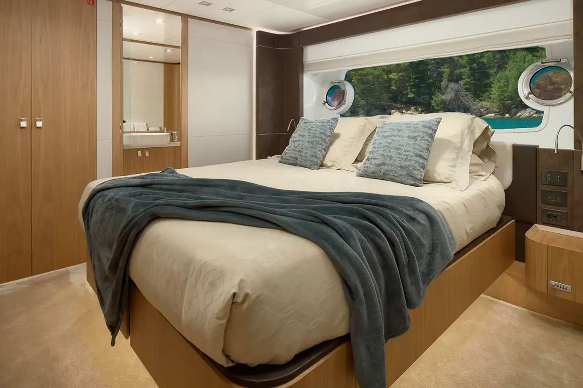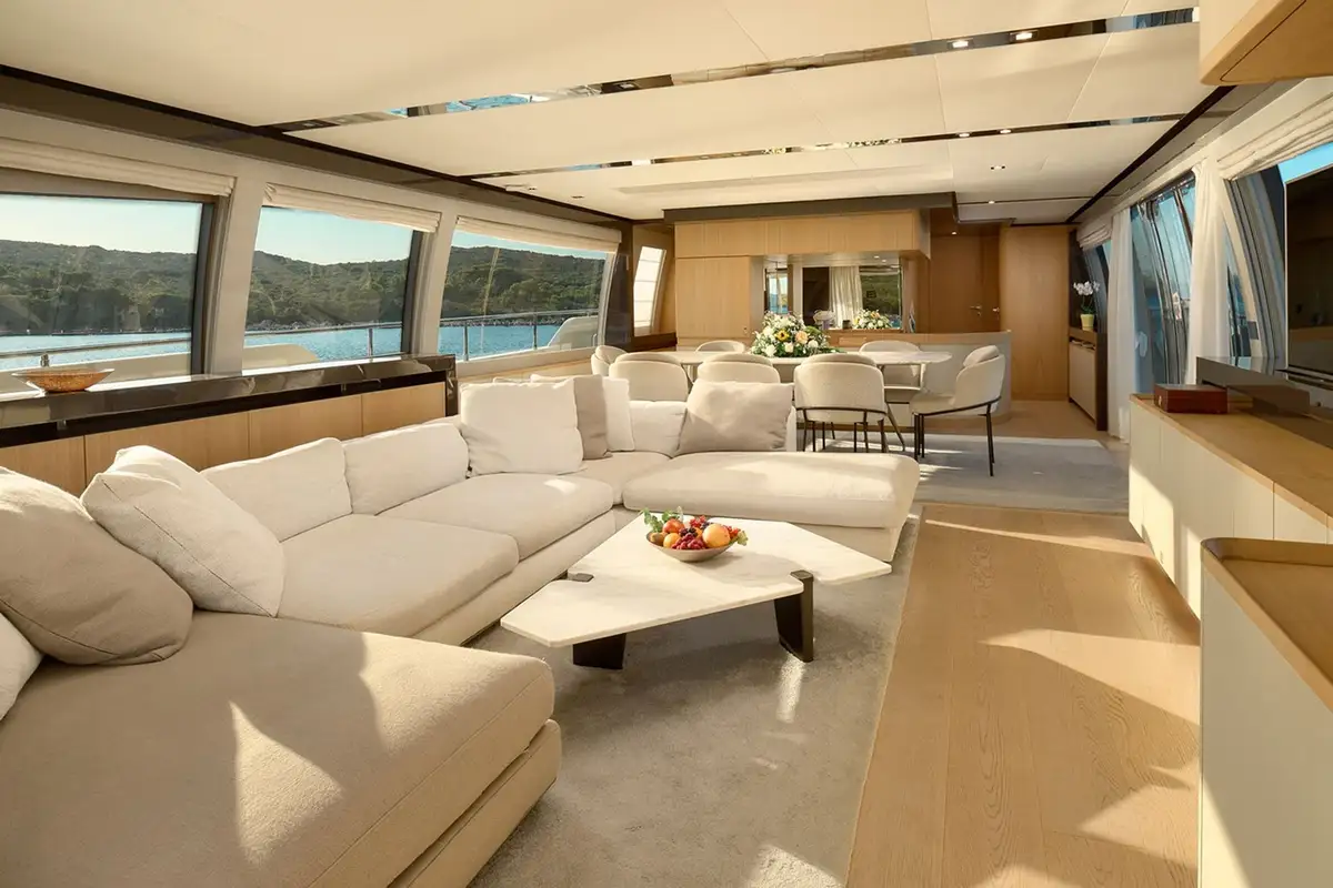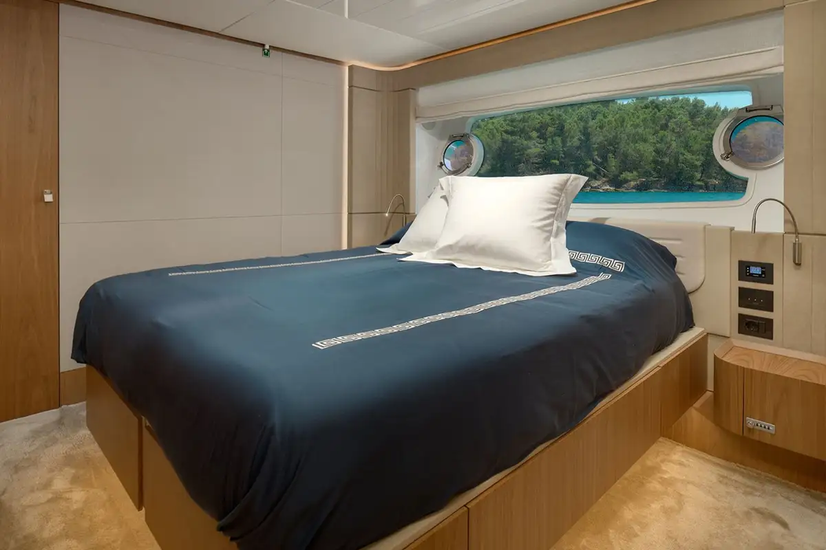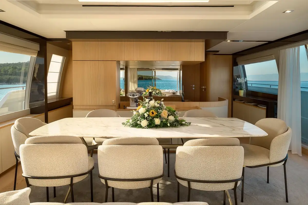 The motor yacht can accommodate 10 guests in 5 cabins. She features a bright and airy interior, enhanced by natural tones and abundant light through an impressive array of windows and generous portlights, offering uninterrupted views from the saloon.