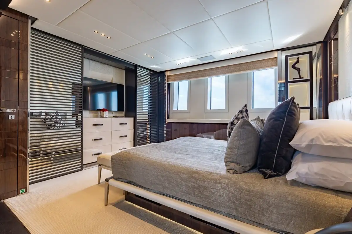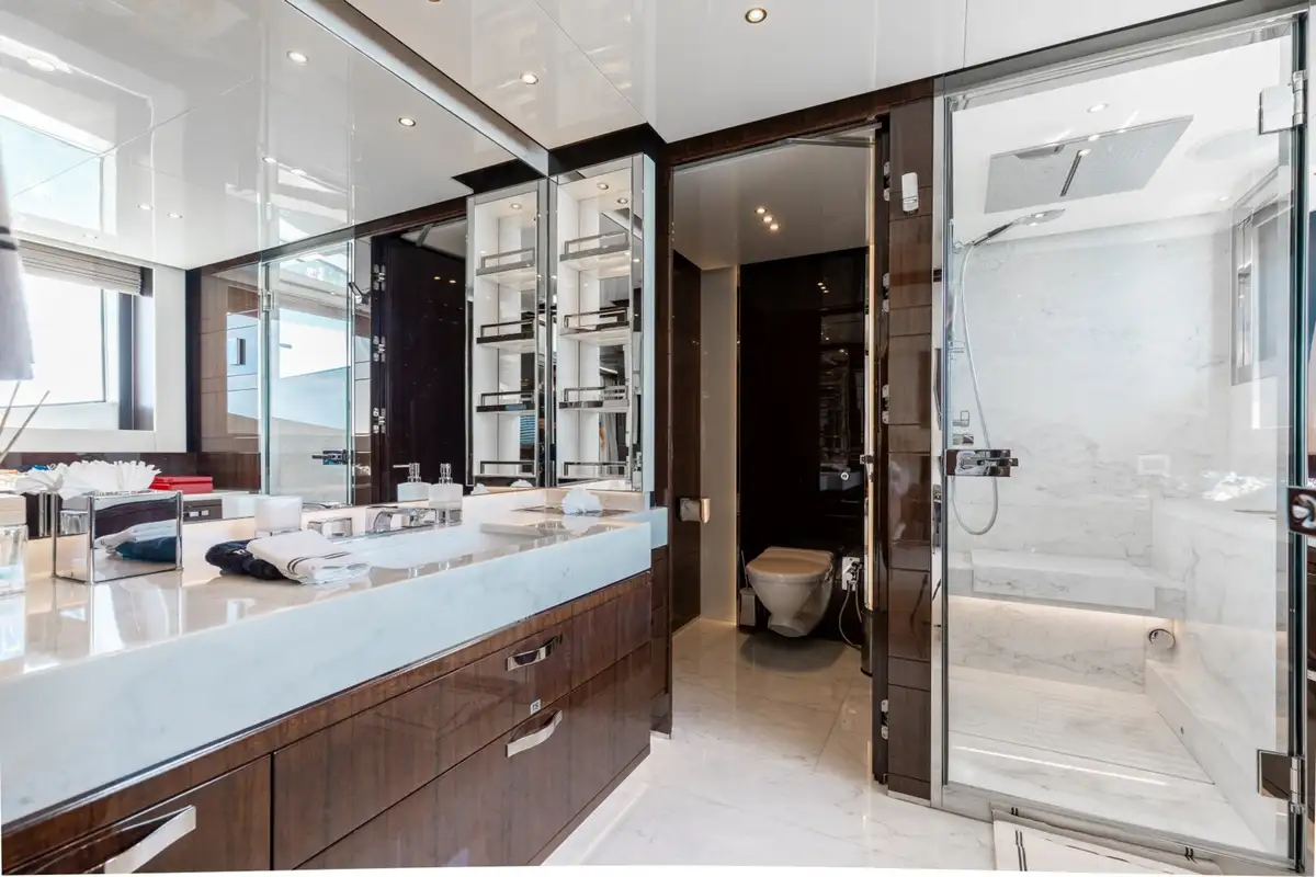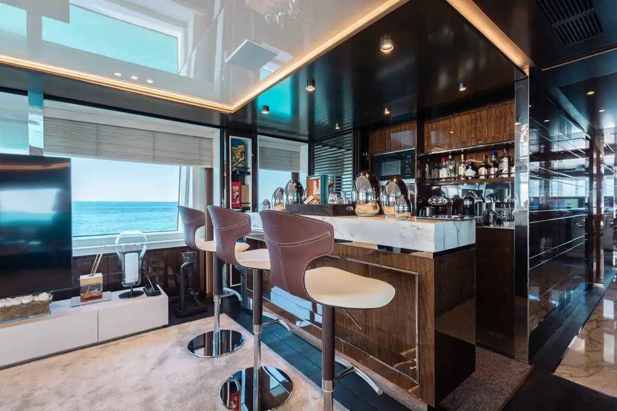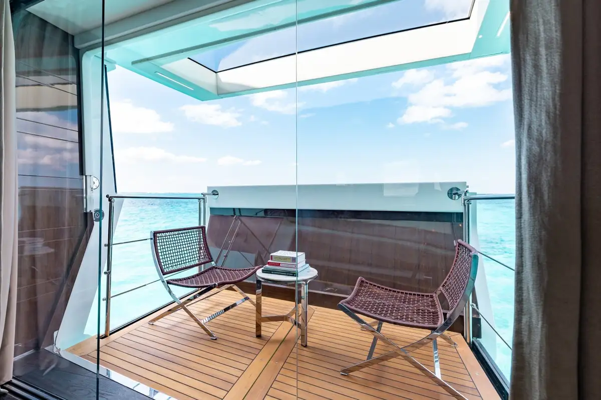 On the main deck, the foyer has a dramatically lit staircase in dark oak and marble with cream leather walls. Large windows and sliding glass doors give the main saloon fantastic panoramic views and flood the charming space with plenty of natural light. The main saloon has a dining area, bar and outdoor games. Easy access is available from the spacious aft deck to the opening beach platform. The nearby beach club has a shower, a day head and even a bar. DOMANI also has an opening side door for launching tenders and watersport equipment.
