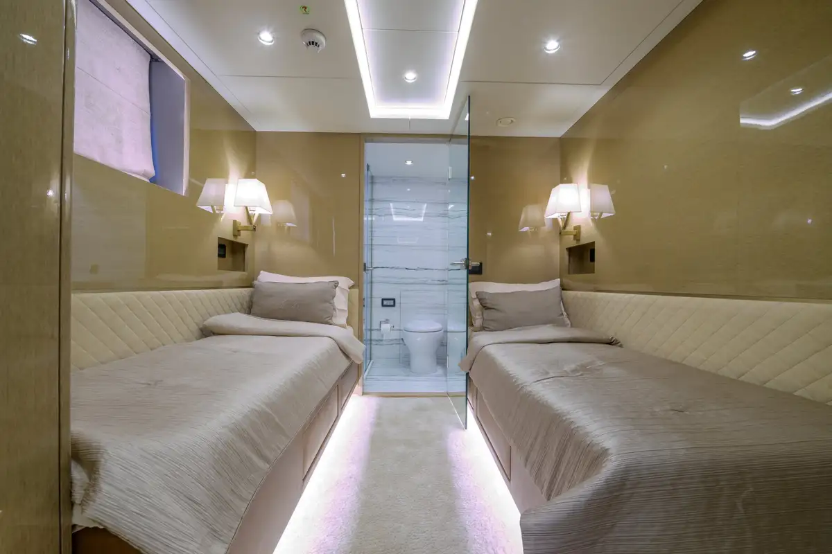 - Accommodation for 10 guests in five cabins, including two master suites (upper deck and full-beam on main deck forward), full-beam VIP, and two twins on the lower deck