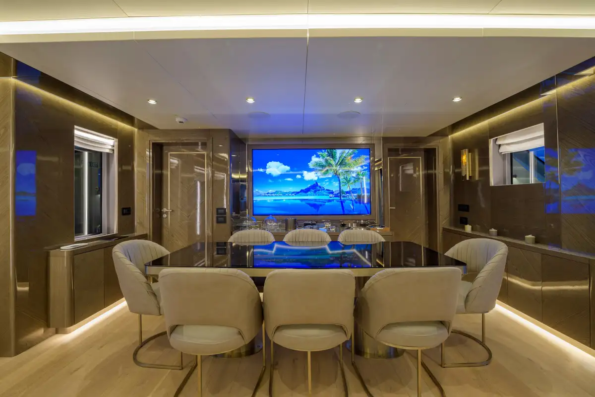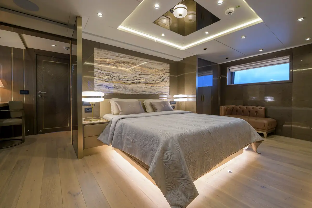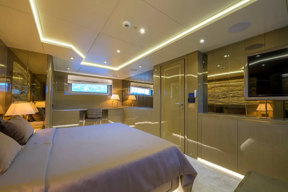 Her beautifully styled interior is light-filled and contemporary, offering a large salon, an elegant indoor dining area, and a fully equipped bar. Accommodation is designed for up to 10 guests in five luxurious cabins, including two master suites—one full-beam on the main deck forward and the other on the upper deck—as well as a full-beam VIP cabin and two twin cabins on the lower deck.