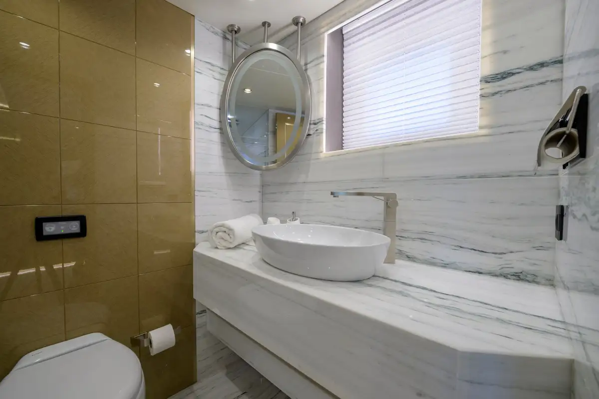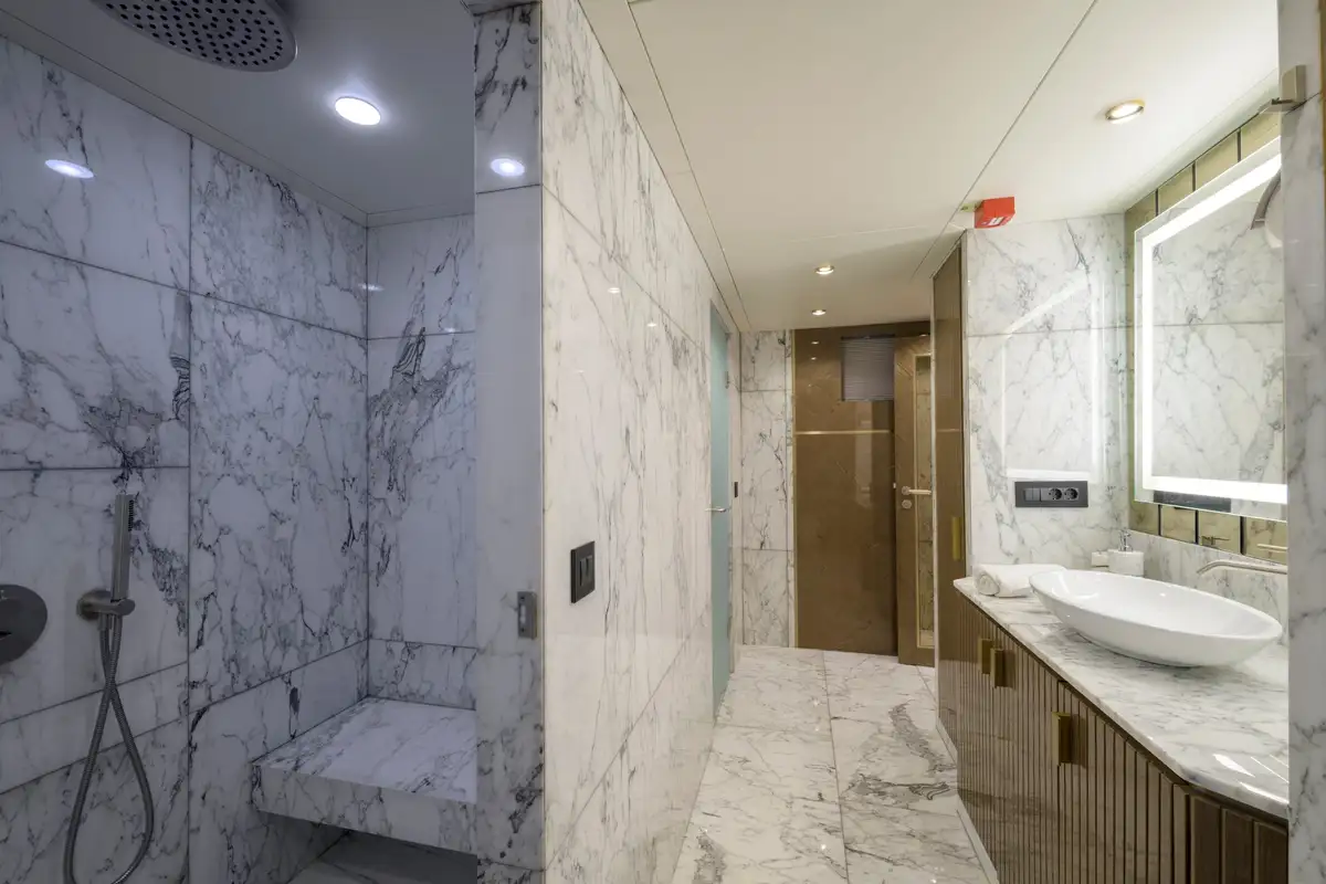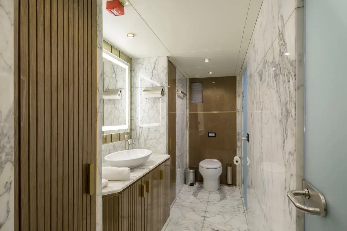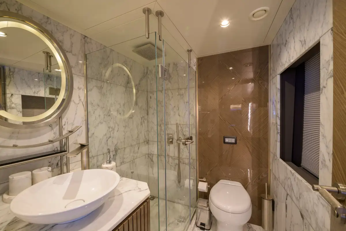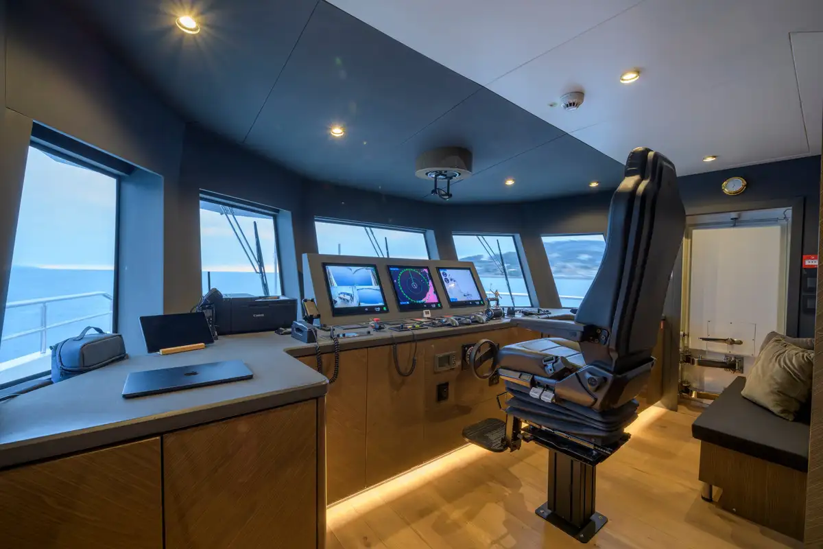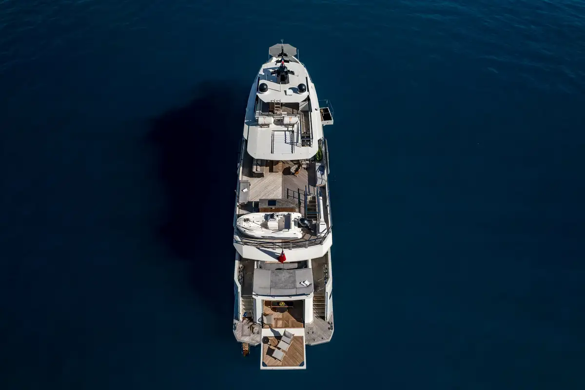 Powered by twin MAN 1,300HP engines, EBYSHINE reaches a top speed of 13.5 knots and cruises comfortably at 10 knots, with an outstanding range of 4,050 nautical miles. She is equipped with CMC zero-speed stabilisers for enhanced comfort underway and at anchor, and is RINA classified for short-range charter.