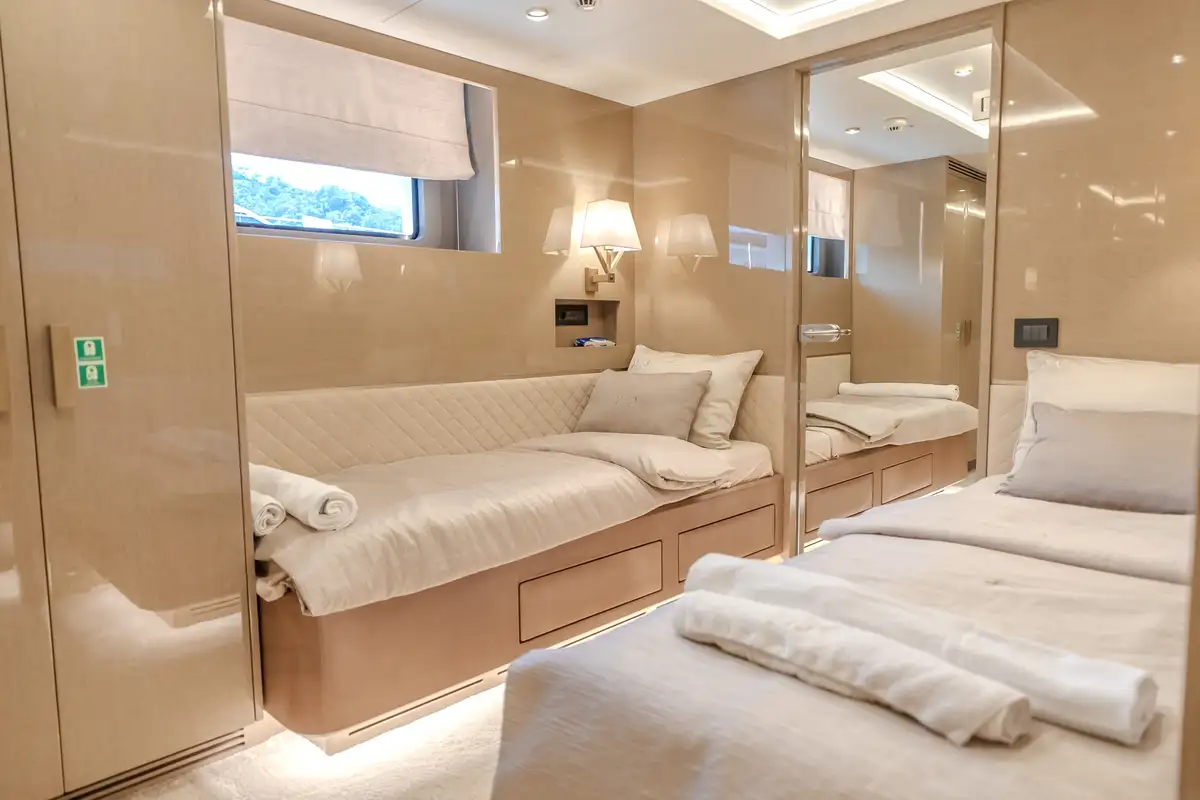 Her beautifully styled interior is light-filled and contemporary, offering a large salon, an elegant indoor dining area, and a fully equipped bar. Accommodation is designed for up to 12 guests in five luxurious cabins, including two master suites—one full-beam on the main deck forward and the other on the upper deck—as well as a full-beam VIP cabin and two twin cabins on the lower deck.