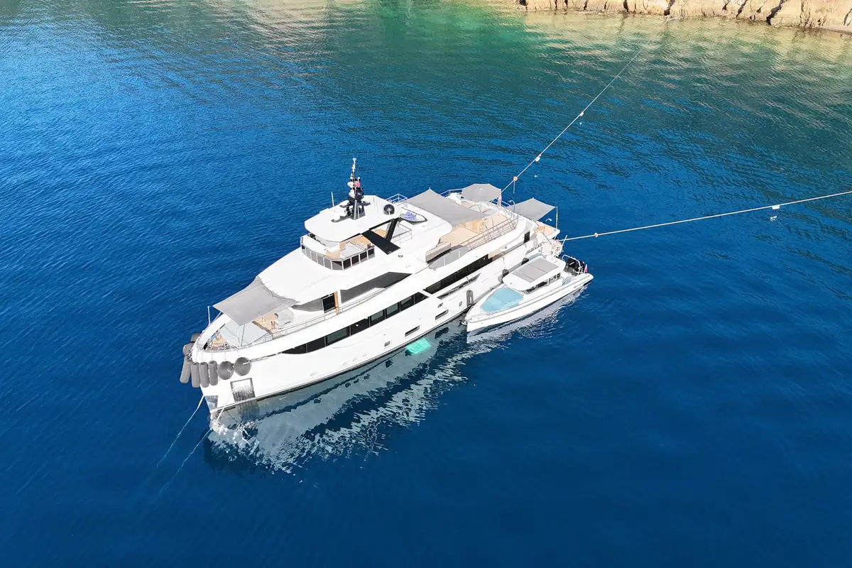 Powered by twin MAN 1,300HP engines, EBYSHINE reaches a top speed of 14 knots and cruises comfortably at 11 knots, with an outstanding range of 5,000 nautical miles. She is equipped with CMC zero-speed stabilisers for enhanced comfort underway and at anchor, and is RINA classified for short-range charter.