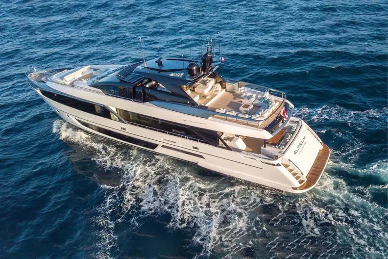 The 34m yacht ELYSIUM I was built in 2019 by Riva. She features an exterior design by Mauro Micheli and an interior by Mauro Micheli. She cruises at 23 knots and reaches a top speed of 26 kn. She can sleep up to ten guests taken care of by a crew of five.