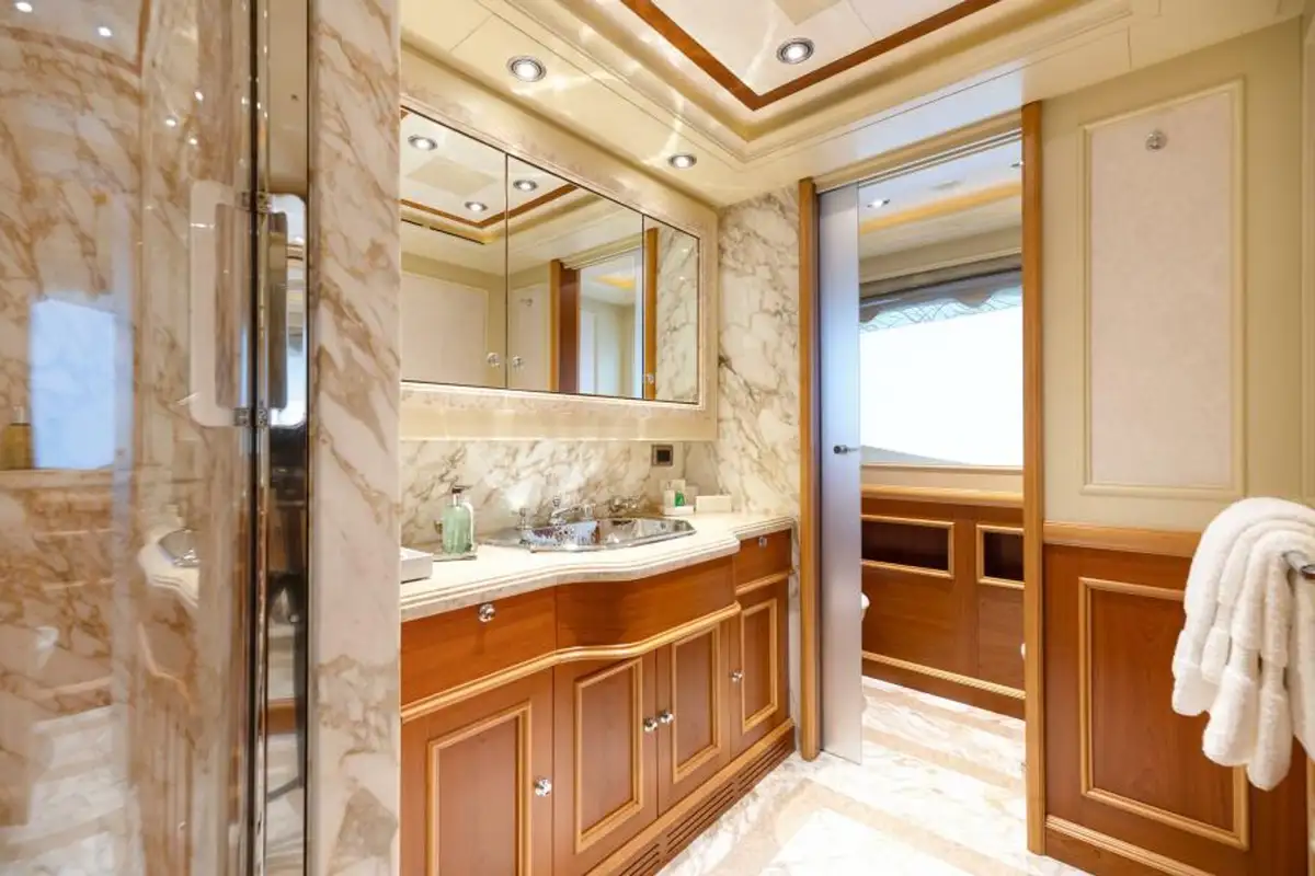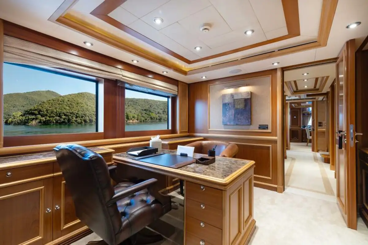 The owner’s suite is forward on the main deck and features a private office/lounge, walk-in wardrobe, his-and-hers marble bathroom with a shared shower and, uniquely, a bath on the balcony to starboard. On the lower deck two VIP suites, a double cabin and a twin cabin, all en suite, complete versatile family accommodation for 10 guests in five cabins. She also sleeps nine crew.