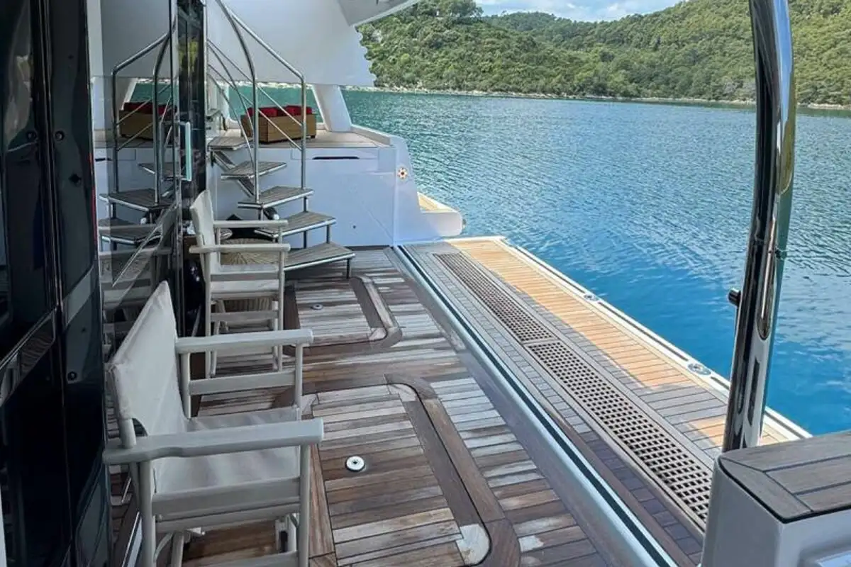 The upper deck aft has a large entertaining space with open-air dining shaded by the overhang, a sun lounge aft and a sit-up bar inside the sky lounge for refreshments. There is a lounge area with a daybed on the main deck aft and steps to starboard lead down to the swim platform. The transom folds down to create a larger deck space and inside sliding glass doors is a fully equipped gym and sauna. From the main deck aft sidedecks run forward to steps leading up to a Portuguese bridge lounge and access to the foredeck.