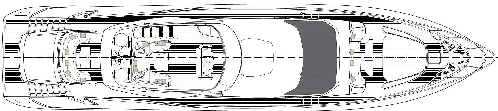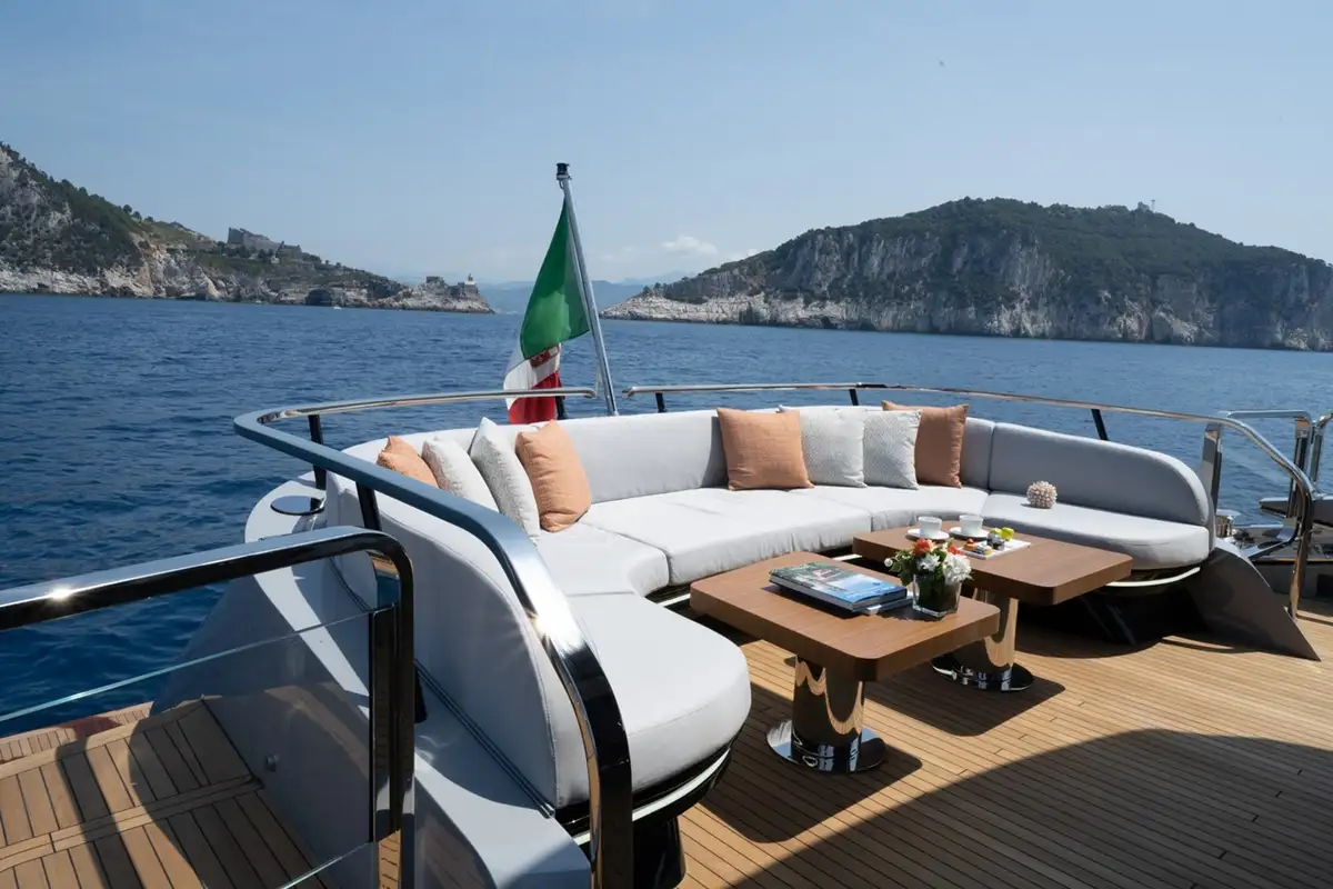 Exterior spaces include a sunbathing and seating area on the foredeck, and a 30 square metre flybridge up top with a helm station inspired by automotive design and U-shaped seating astern. The aft cockpit on the main deck is partially sheltered by the flybridge overhang and set up for dining, with banquette seating aft. Steps lead down on both sides of the top-opening transom door to the large bathing/boarding platform and garage, which has space for a five-metre tender and a three-seater jet ski.