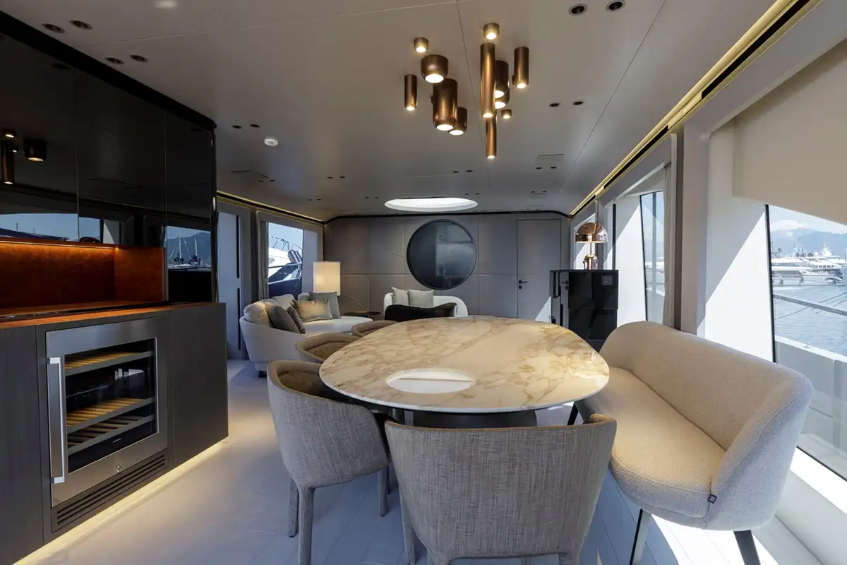 She has just under 200GT of internal volume and is configured to host up to ten guests in four cabins, which are all located forward on the lower deck. The master cabin is a full-beam suite amidships with a walk-in closet and large en suite bathroom. There’s another full-beam VIP double in the bow, a double cabin to port and a twin-bed cabin to starboard. The crew accommodation is amidships, between the owner’s suite and the engine room, with two twin bunk rooms, a messroom and the yacht’s main galley. The main deck has an open-plan saloon and dining area with floor-to-ceiling windows and a separate pilothouse up front.