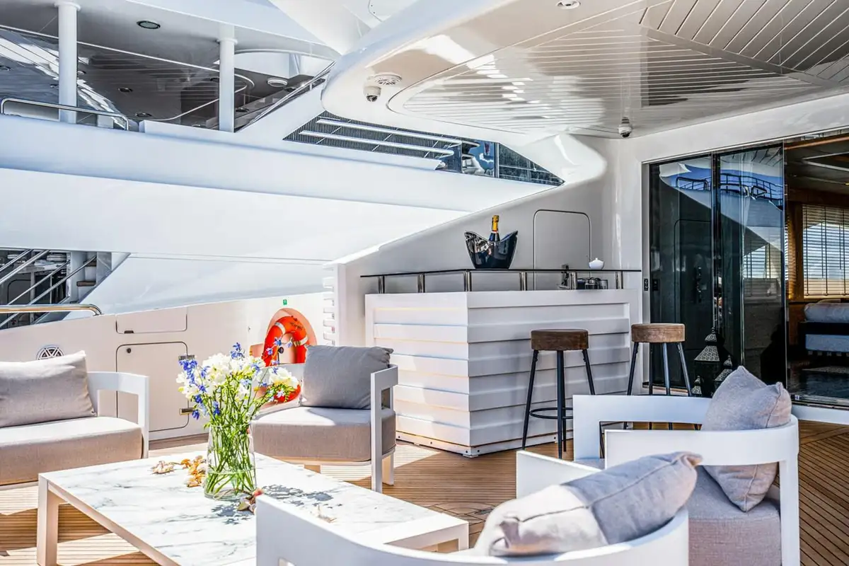Inside, contemporary elegance meets comfort, with soft furnishings and a light-filled atmosphere. The spacious main deck saloon offers generous sofa seating, flowing seamlessly to the formal dining area which seats 10.