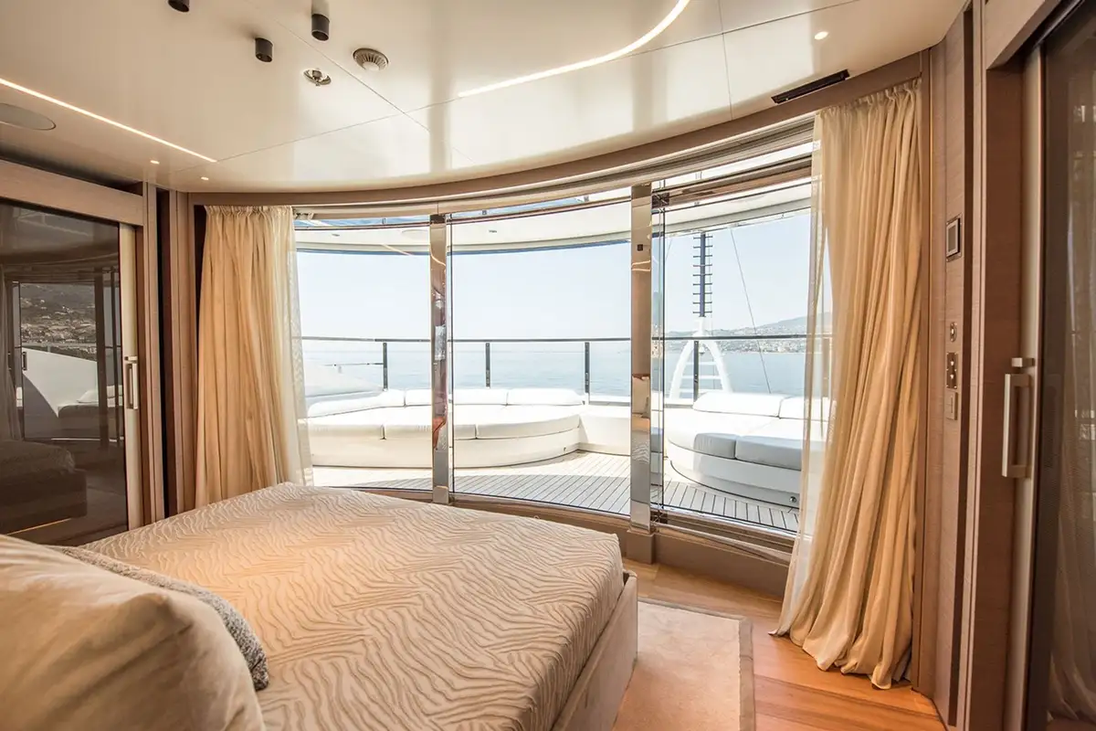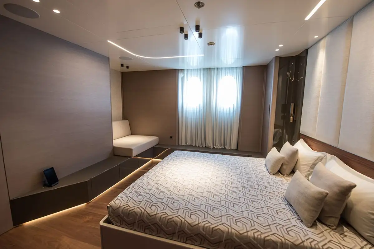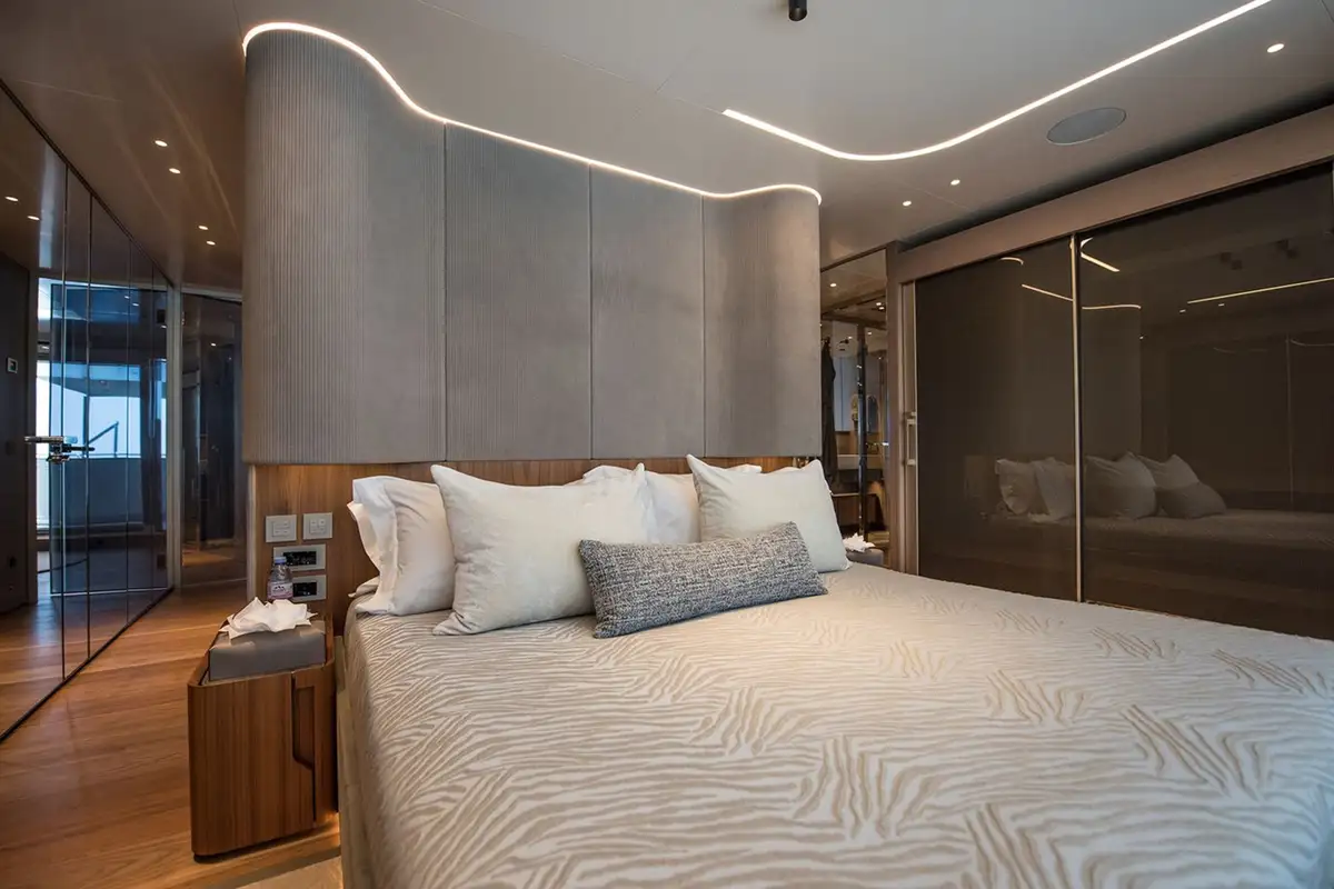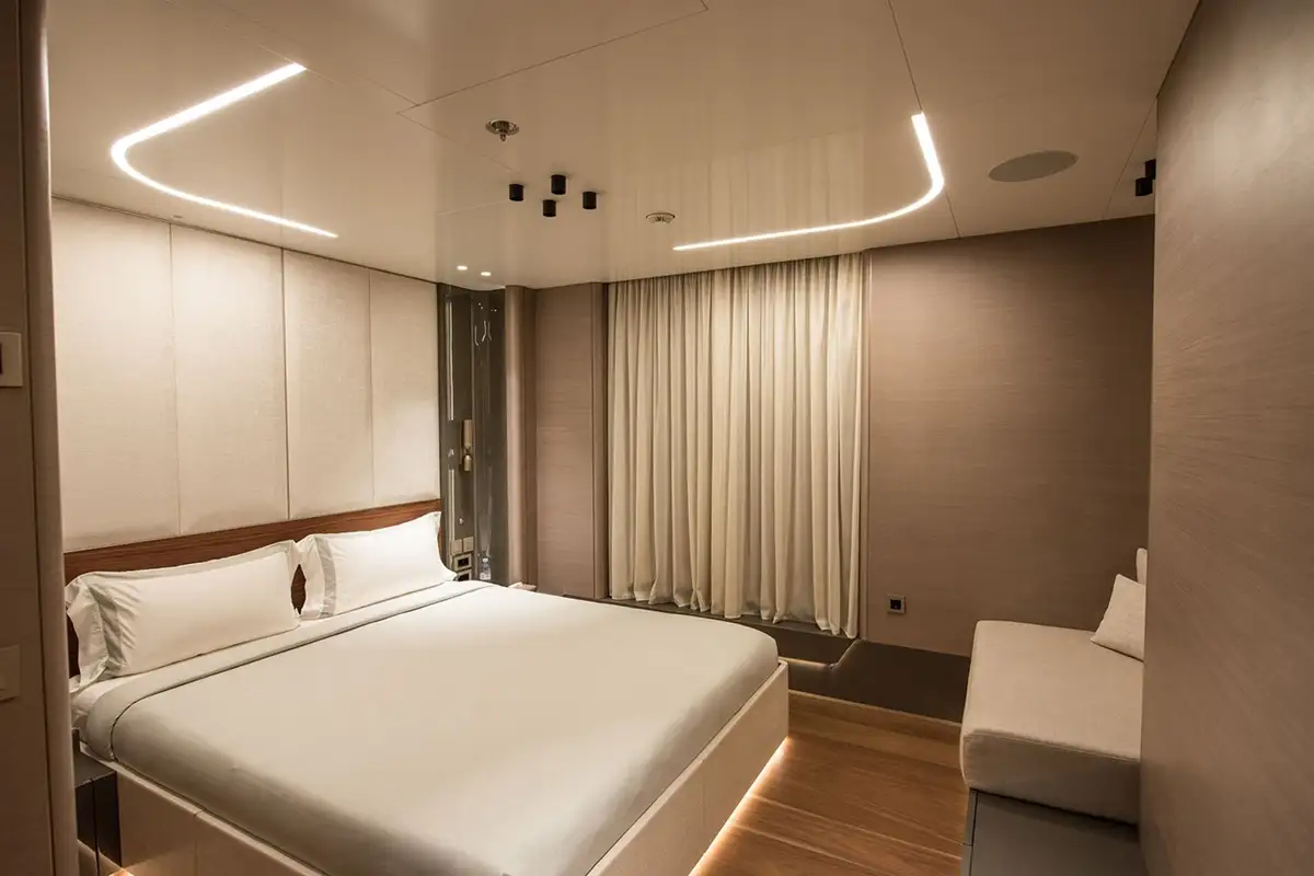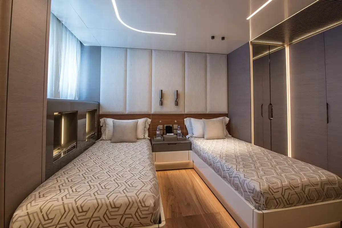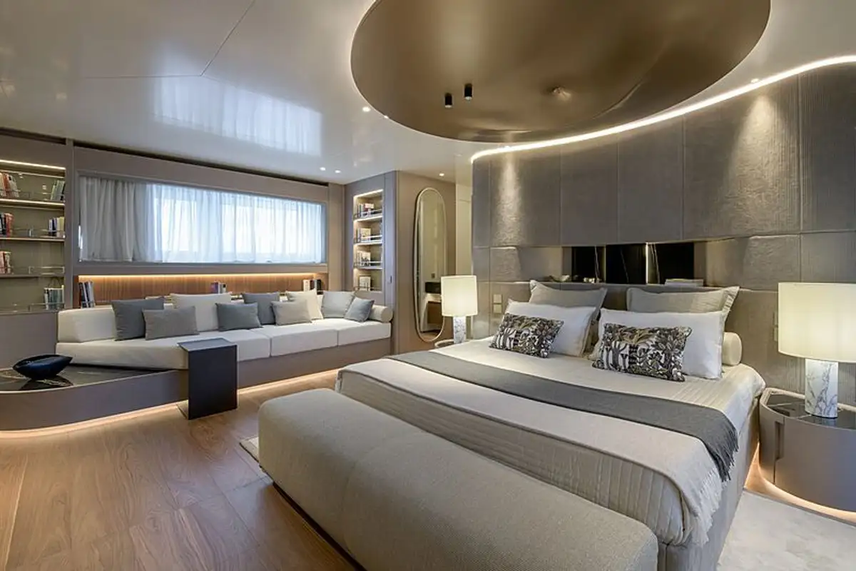 FLORENTIA accommodates up to 12 guests in six spacious staterooms, including a main deck master suite with a private balcony and two walk-in wardrobes. The upper deck features a VIP suite with a private balcony and direct access to the aft Jacuzzi. The lower deck houses two king-size staterooms and two doubles, all en suite, ensuring comfort and privacy for all guests.