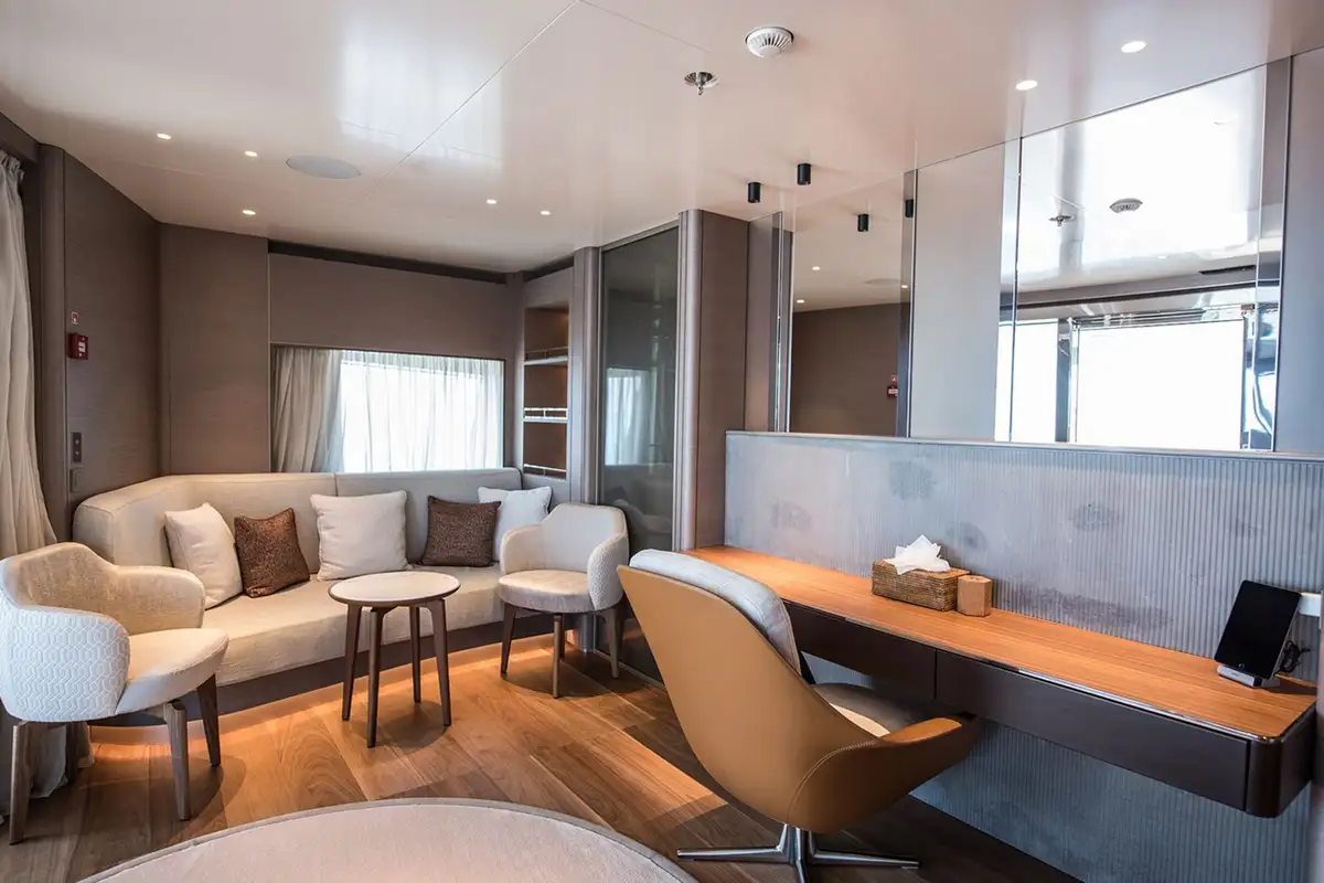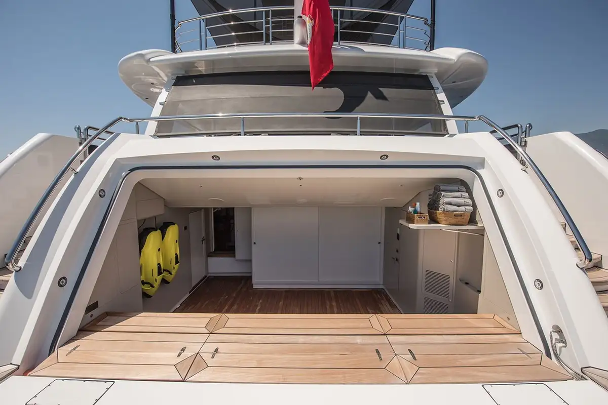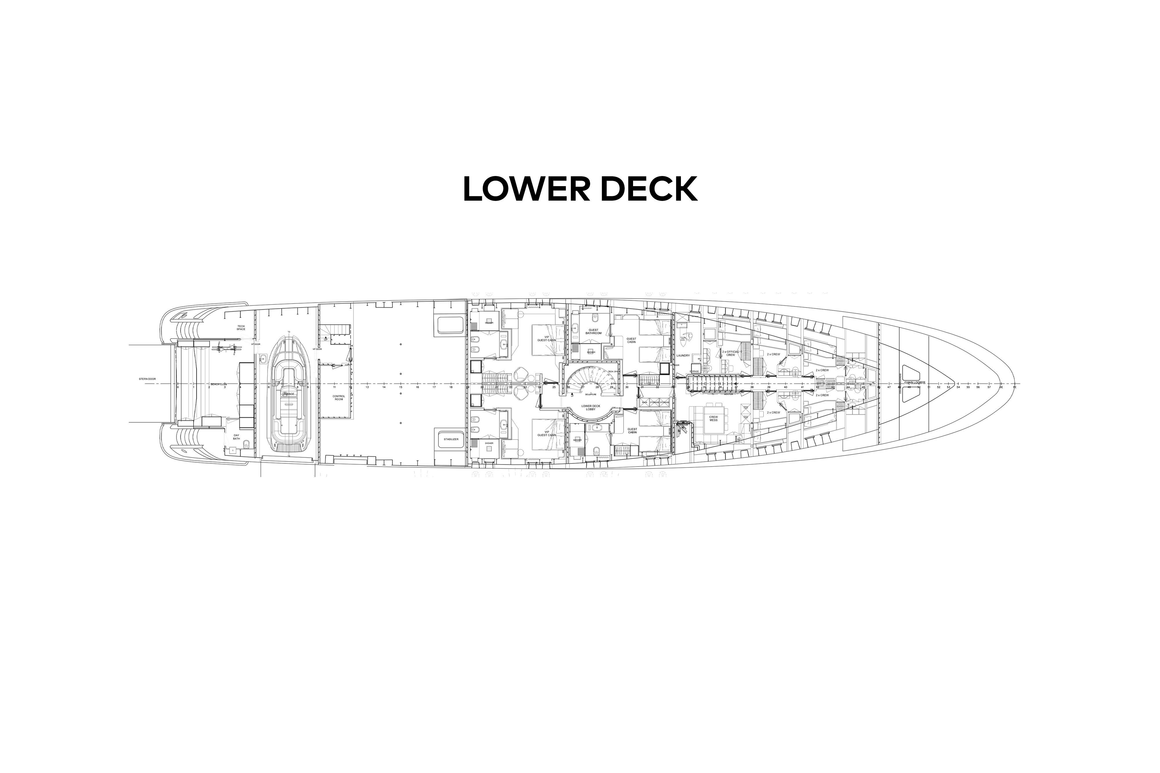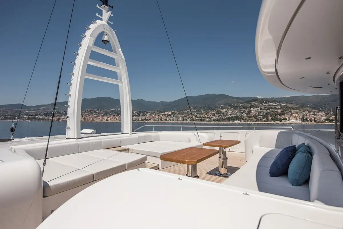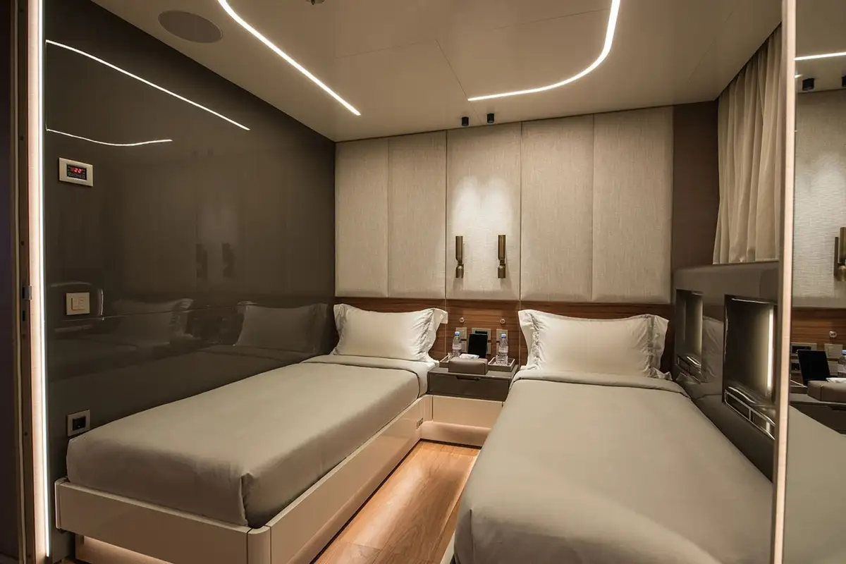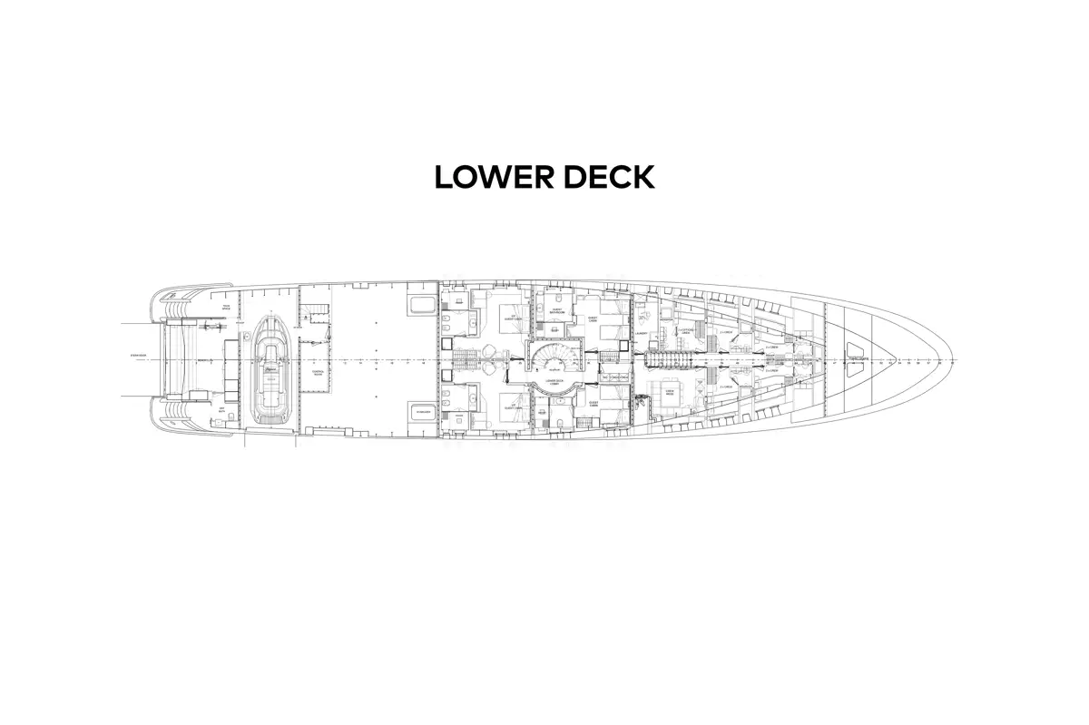 FLORENTIA accommodates up to 12 guests in six spacious staterooms, including a main deck master suite with a private balcony and two walk-in wardrobes. The upper deck features a VIP suite with a private balcony and direct access to the aft Jacuzzi. The lower deck houses two king-size staterooms and two doubles, all en suite, ensuring comfort and privacy for all guests.
