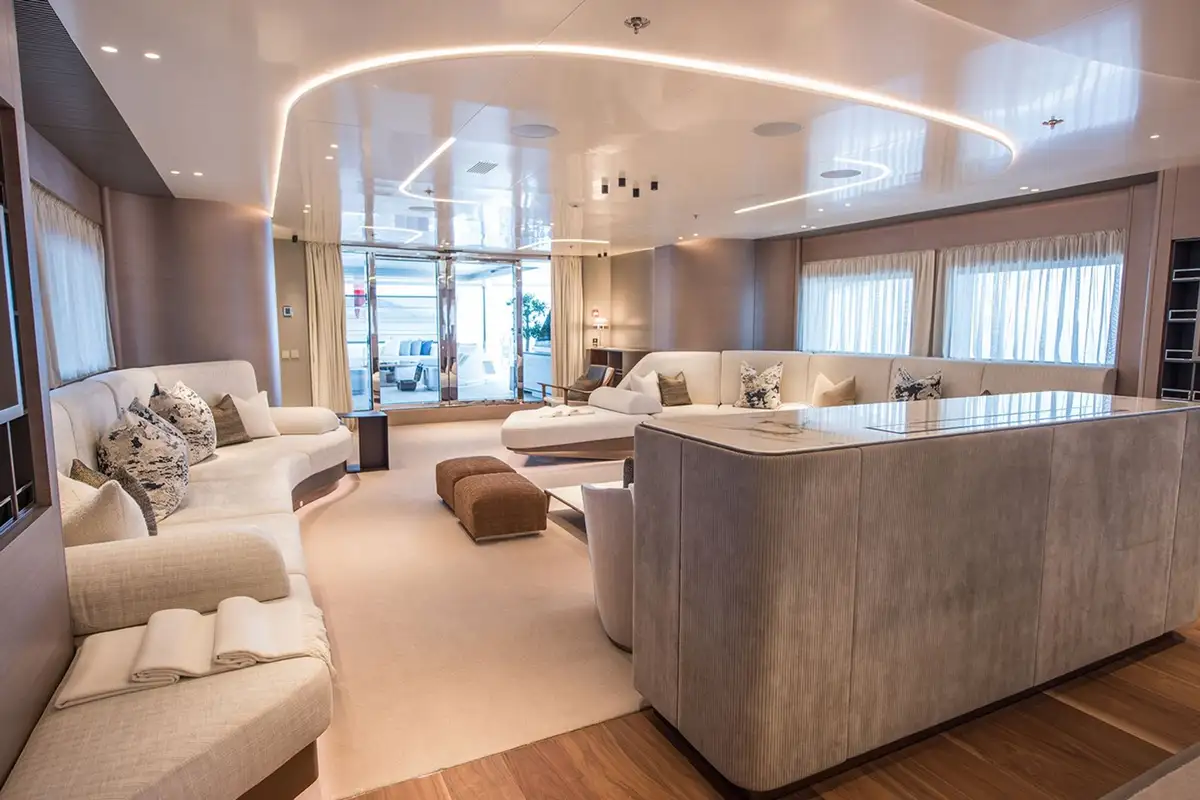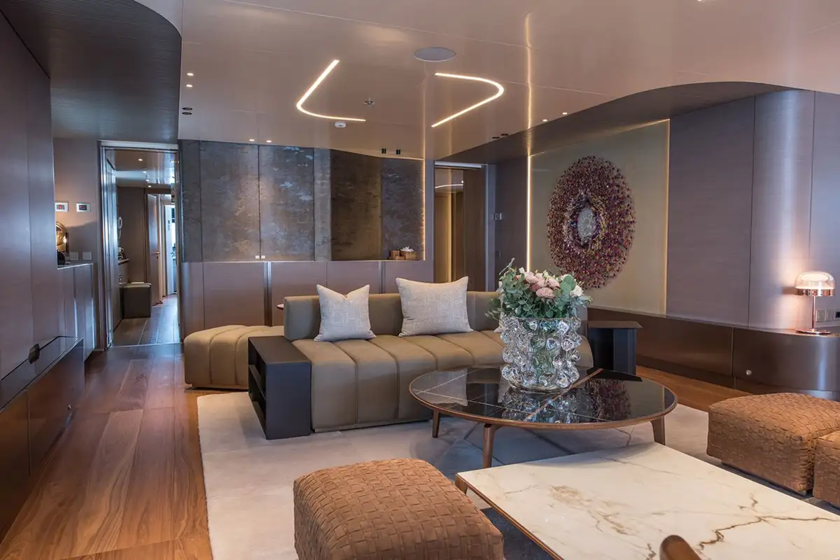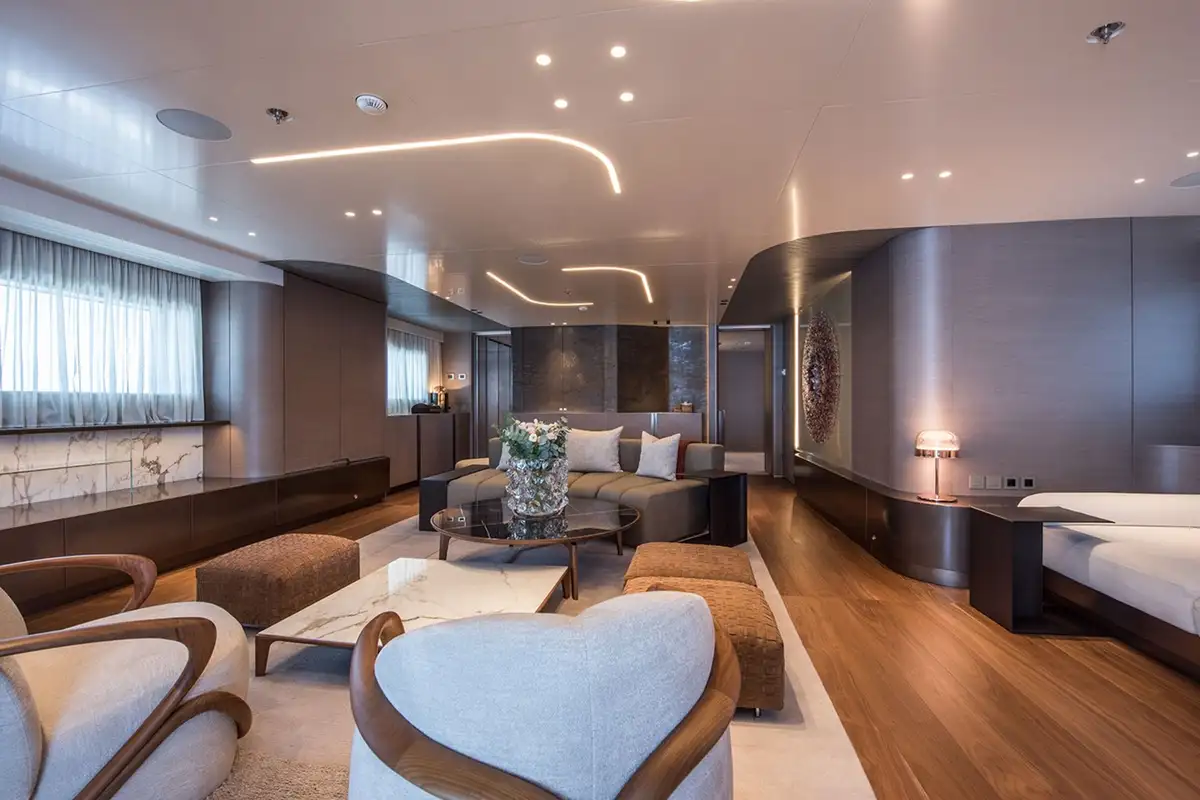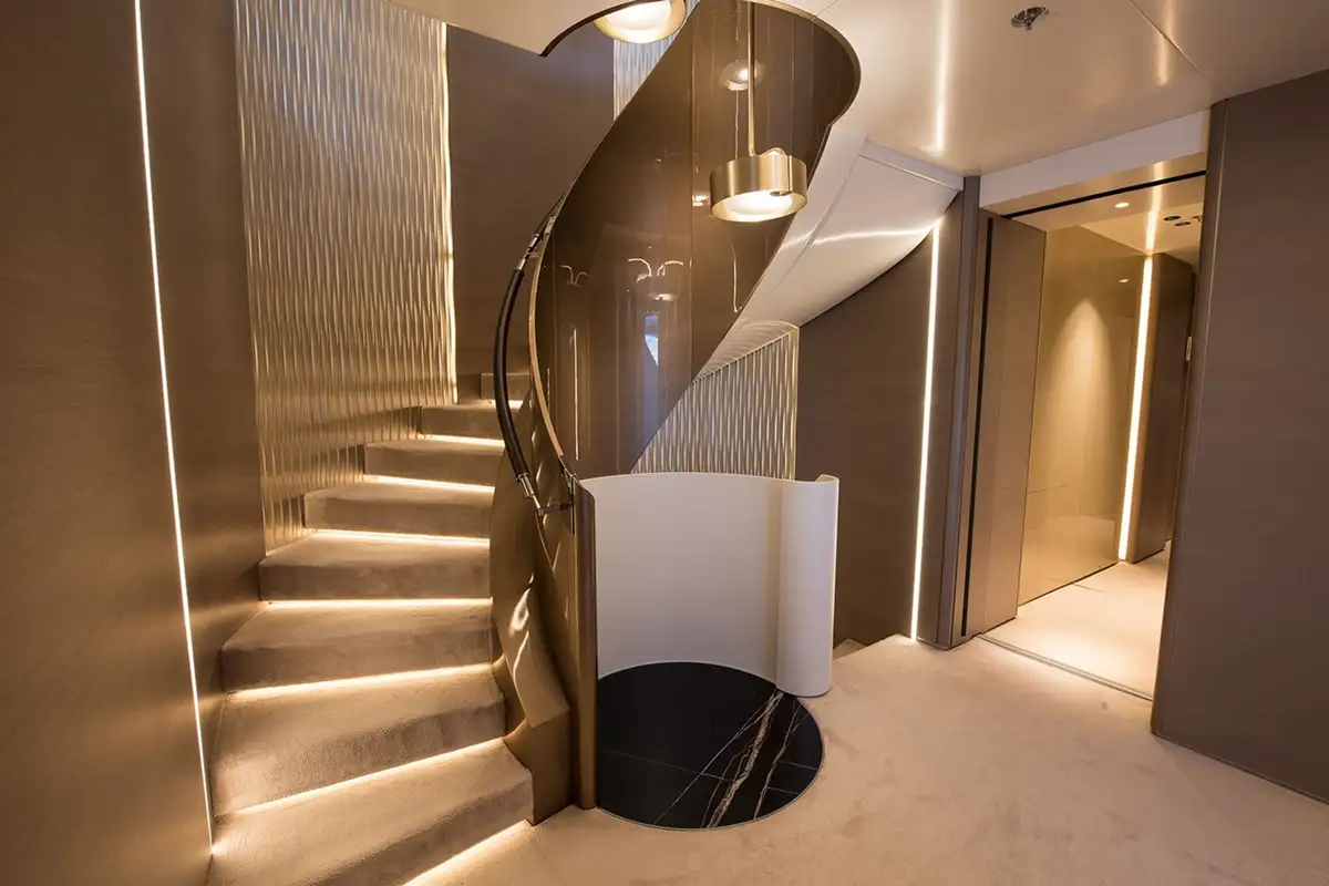 Studio Vafiadis has crafted an exterior profile that is both graceful and dynamic, with sinuous lines that evoke a sense of movement and sophistication. The steel hull and aluminium superstructure not only ensure durability but also contribute to the yacht's sleek and modern aesthetic.. The interiors, conceived by A++ and executed by Carlo Colombo, are inspired by the organic forms of nature and ocean waves. The use of neutral tones, warm woods, and luxurious materials creates a serene and inviting atmosphere throughout the yacht. The central spiral staircase, with its custom-made handrail, serves as a striking architectural feature that connects the three decks seamlessly.
