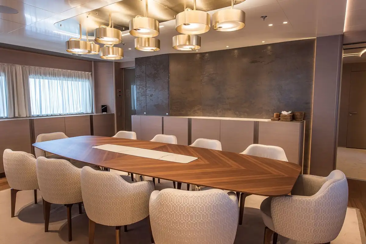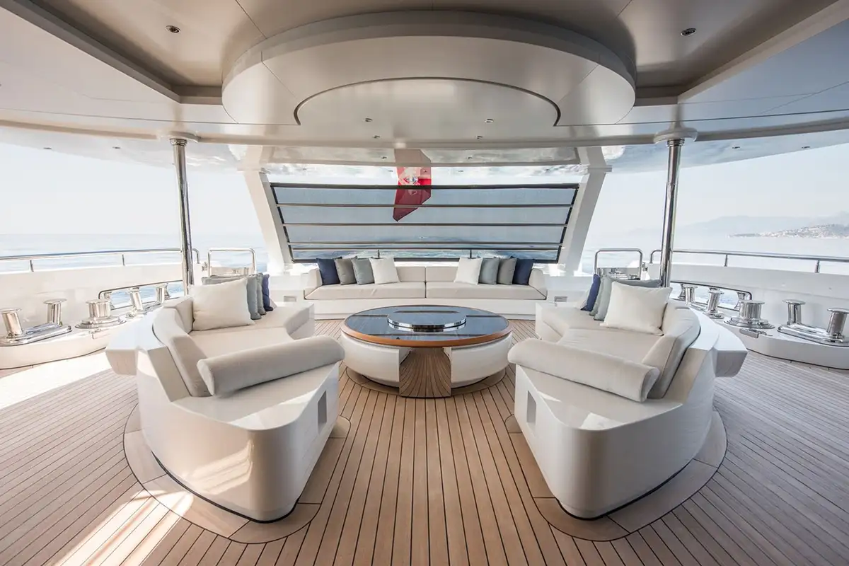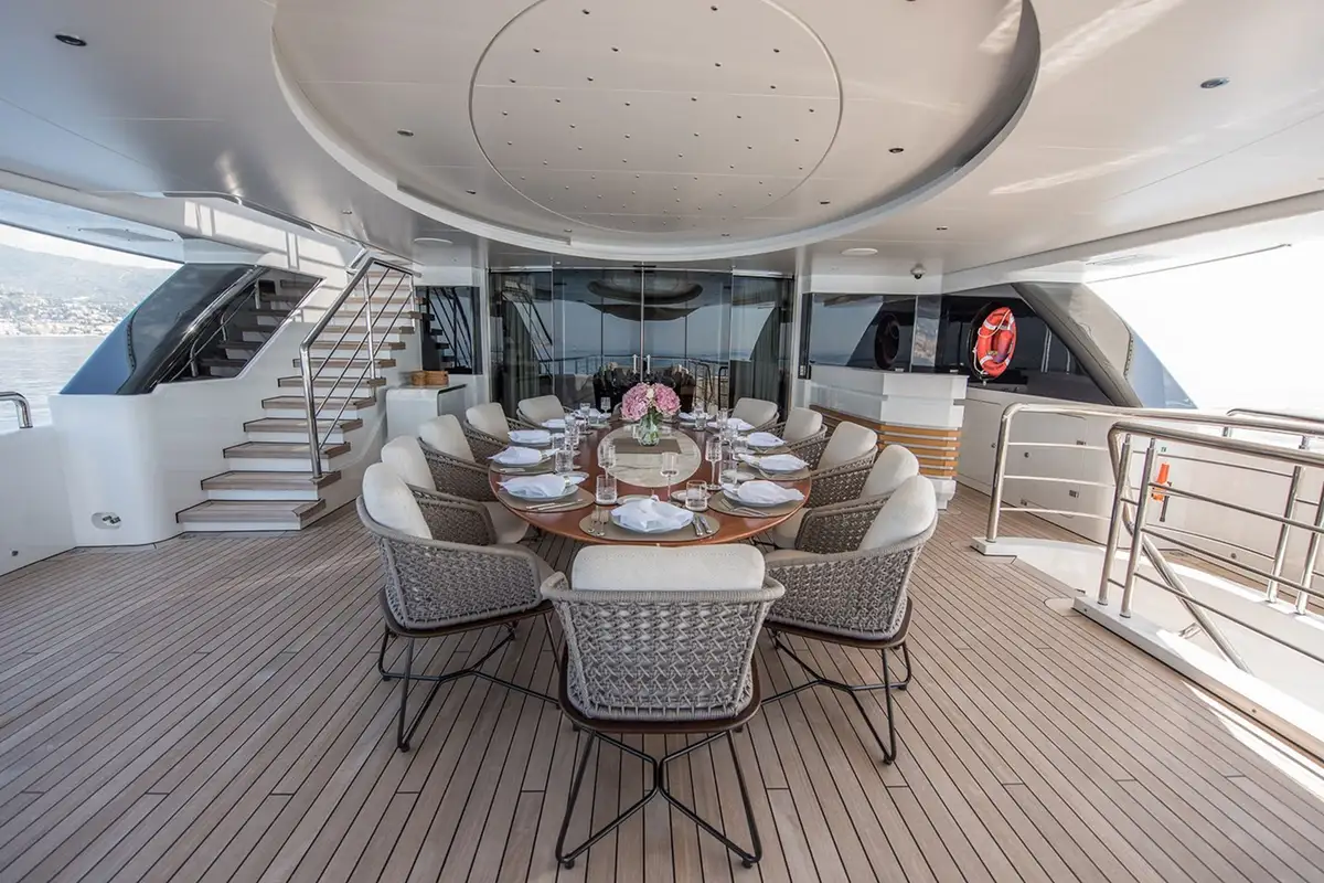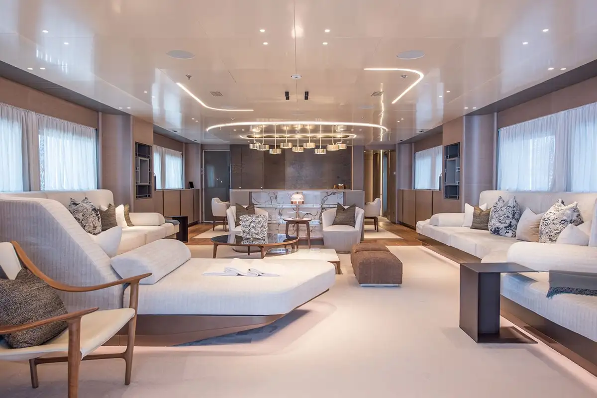 Studio Vafiadis has crafted an exterior profile that is both graceful and dynamic, with sinuous lines that evoke a sense of movement and sophistication. The steel hull and aluminium superstructure not only ensure durability but also contribute to the yacht's sleek and modern aesthetic.. The interiors, conceived by A++ and executed by Carlo Colombo, are inspired by the organic forms of nature and ocean waves. The use of neutral tones, warm woods, and luxurious materials creates a serene and inviting atmosphere throughout the yacht. The central spiral staircase, with its custom-made handrail, serves as a striking architectural feature that connects the three decks seamlessly.