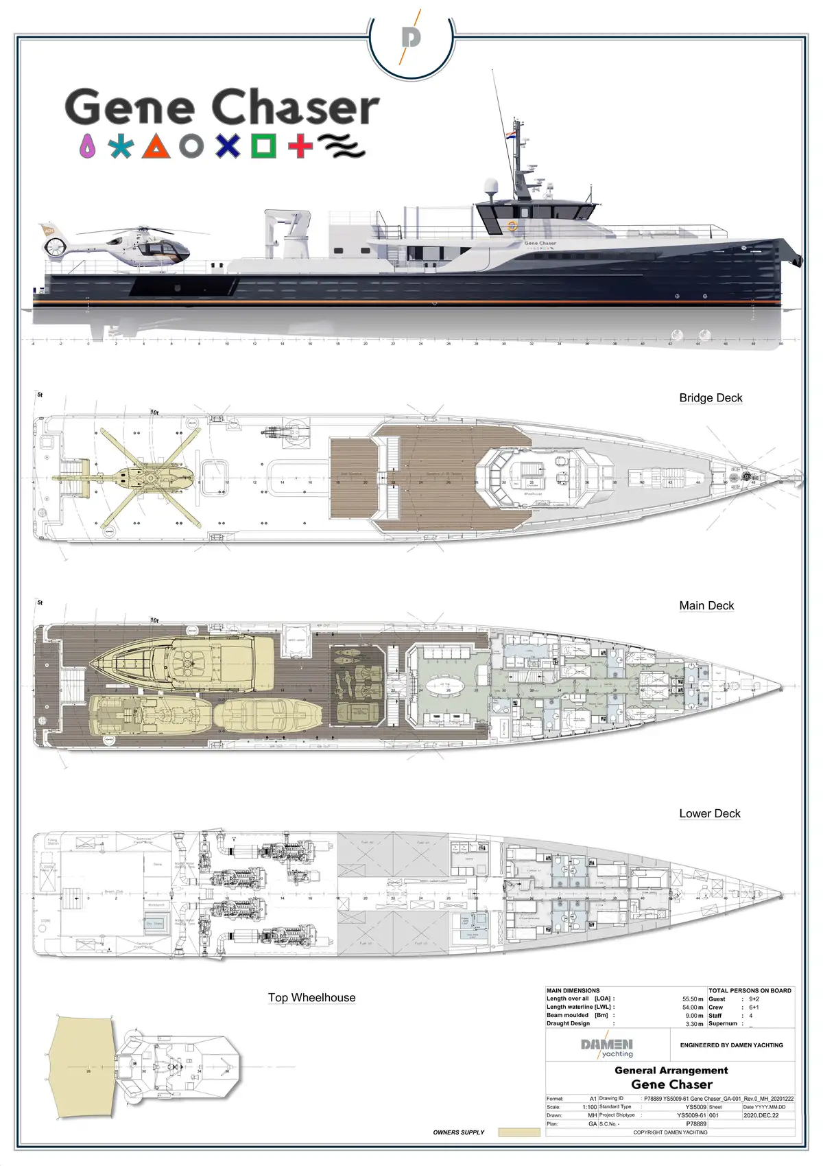 Built by Damen Yachting as YS 5009, she was transformed by her current owner into a working laboratory for scientific research. Other features of her design include a beach club and scuba diving centre, and touch-and-go helipad.