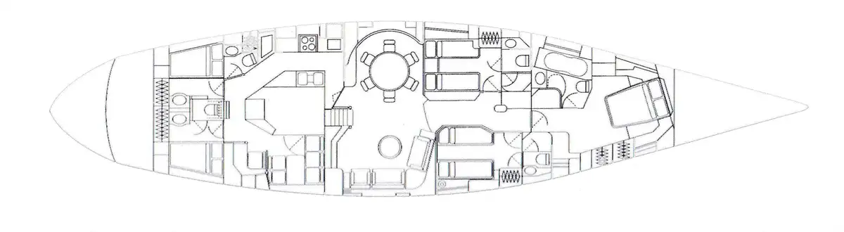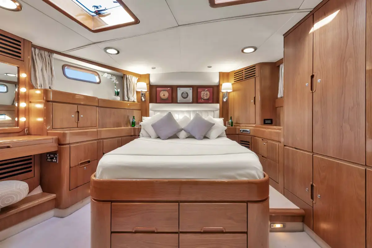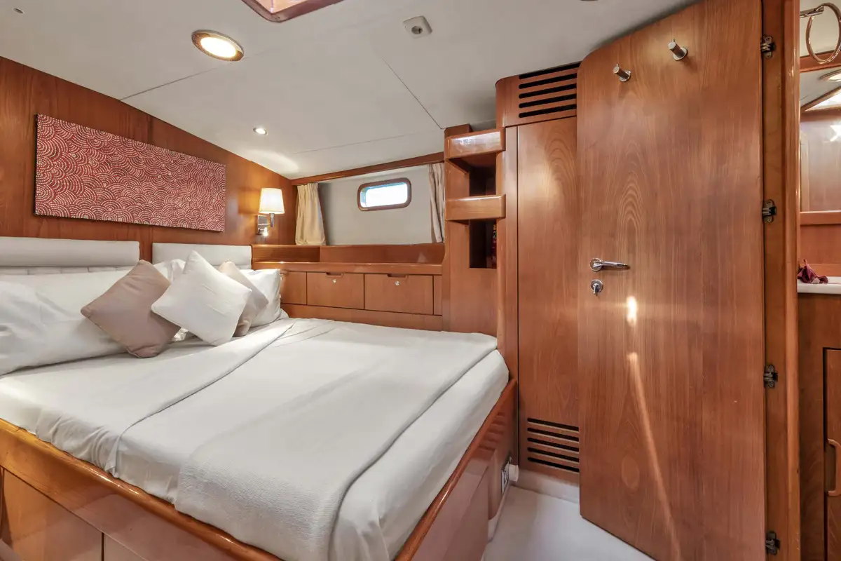 She offers accommodation for 6 guests in a large master stateroom with en suite bath forward, one double or twin cabin(changeable), and one twin cabin - all cabins have ensuite facilities.