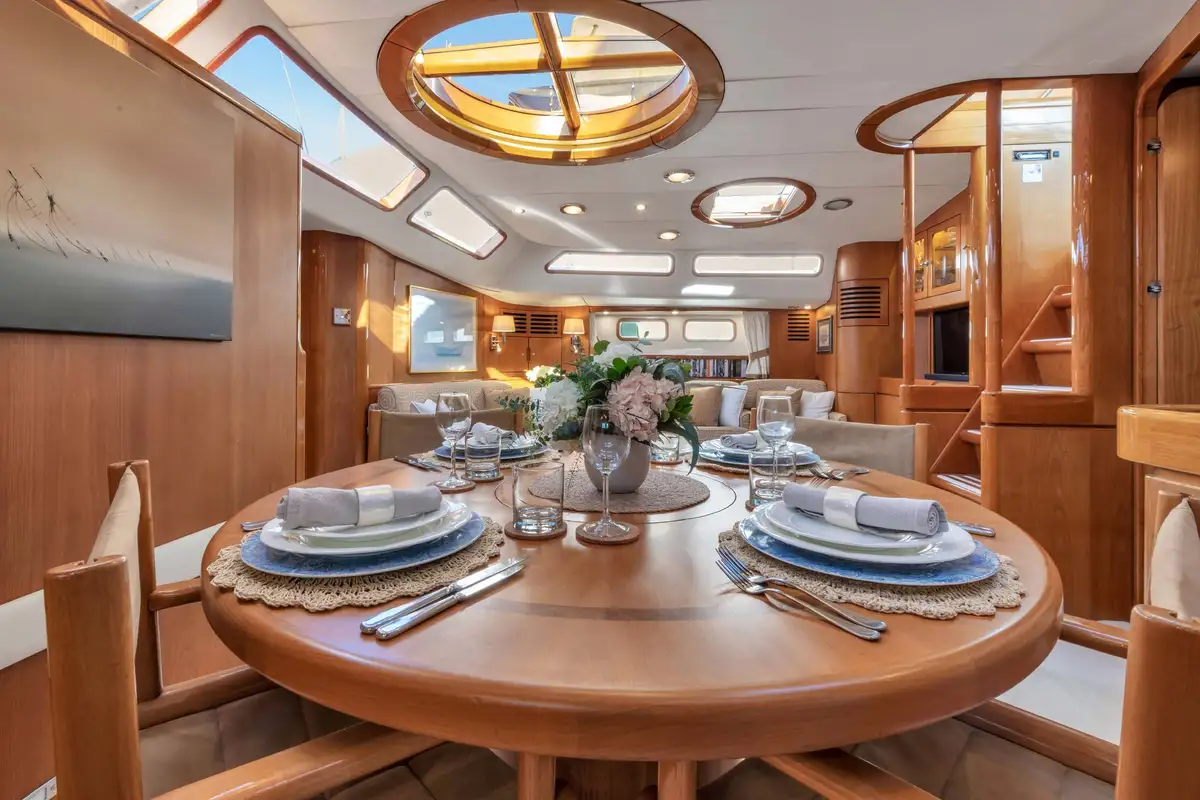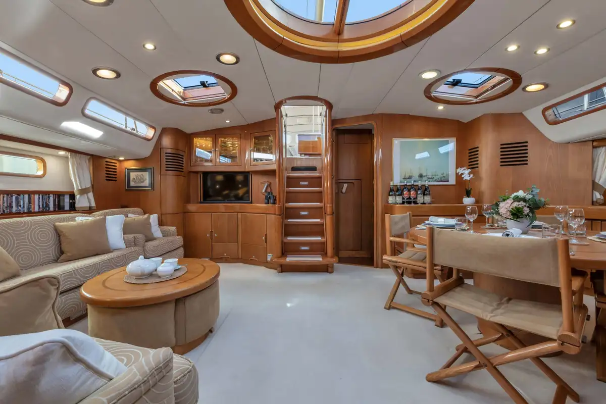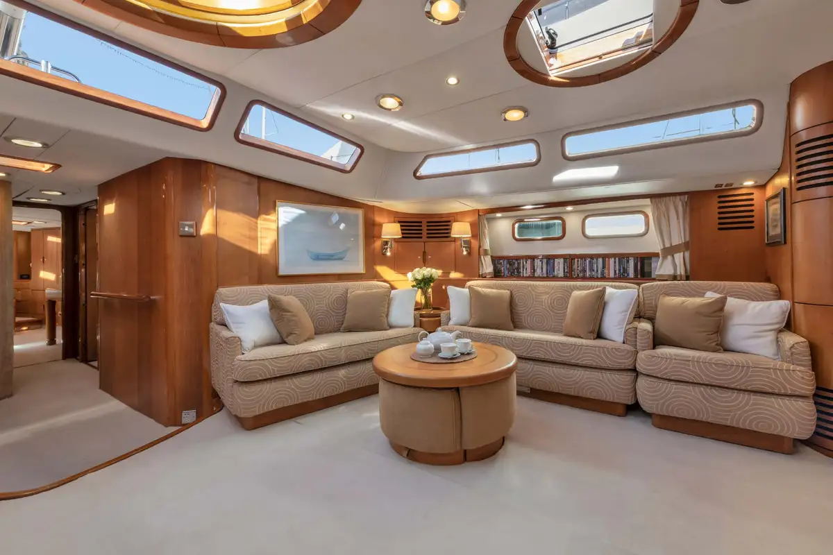 Powerful and exhilarating under sail she has a separate guest cockpit with comfortable seating for 8, ideal for alfresco dining orrelaxing while underway. The interior boasts sweet chestnut joinery inlaid with birds eye maple, combined with the circular skylight this creates a bright and luminous saloon.