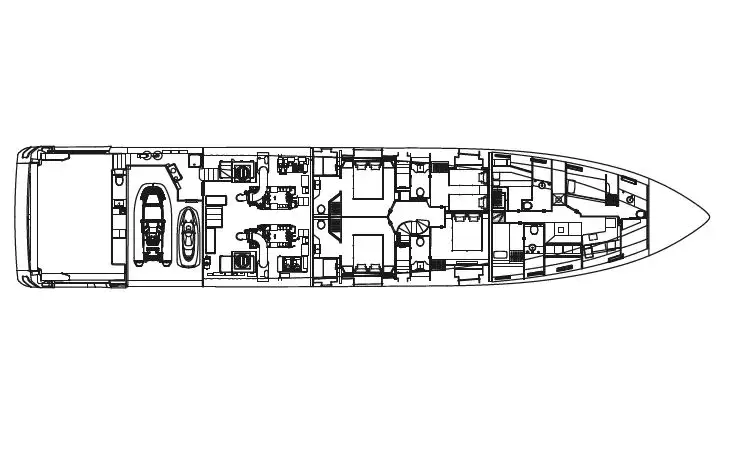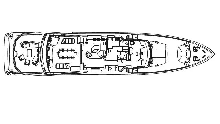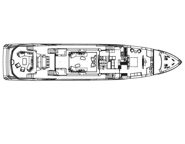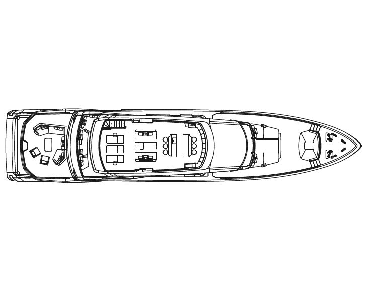 The sun deck has a wet bar area forward and the option of an upper helm position. There are benches on either side of an outside table, plus sun loungers aft. On the upper deck, there is a forward lounge area with seating sunpads around a jacuzzi and a more seating forward. On the aft upper deck, there is an al fresco formal dining area and lounge seating. Between the upper deck and main deck, there is an aft mezzanine deck with seating – this Mezzanine deck accessed from steps leading from the cockpit on the main deck. The cockpit has forward-facing bench seating that can convert into an al fresco dining area. Aft of the cockpit on the lower deck in the beach club area and fold-down transom.