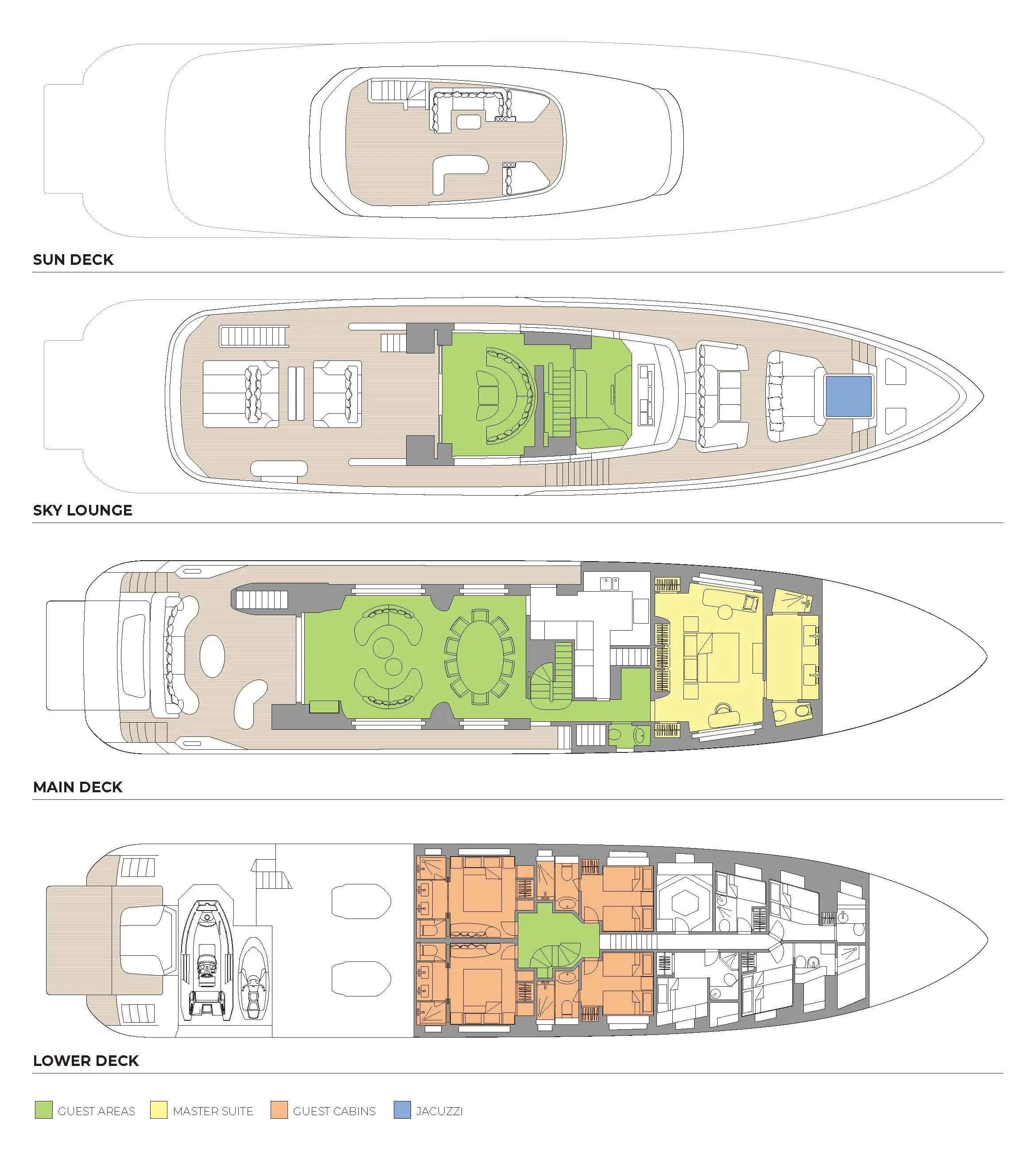 On the sun deck is a wet bar and U-shaped bench seating beneath the hardtop with a sun lounge aft. The upper deck aft has two lounging areas, one beneath the overhang and another in full sun, as well as a buffet bar. To port the sidedeck leads to a foredeck lounge with seating, a large sunpad and a glass jacuzzi.