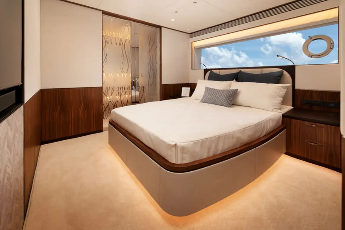 The FD100 offers five staterooms, including a full-beam master suite on the main deck. The Tri-Deck layout option offers a lightweight open flybridge equipped with a helm and seating area atop the bridge deck, which features a forward wheelhouse, interior skylounge with dayhead and bar and jacuzzi aft.
