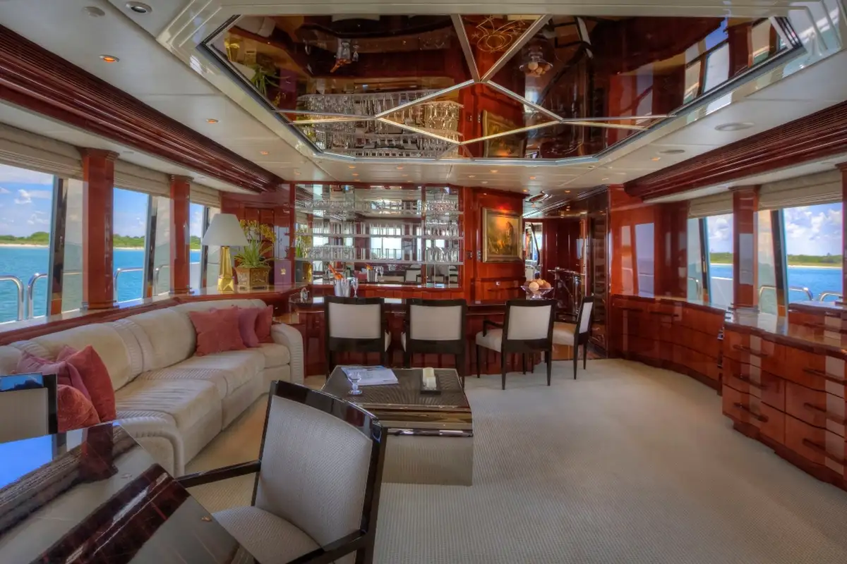 Paola D. Smith & Associates is responsible for the resplendent interior of I LOVE THIS BOAT. Her main salon features a pastel color scheme with high-gloss surfaces and natural woods. This space evokes relaxation thanks to a calming ambiance and atmosphere. Forward, separated by an etched-glass table is the formal dining space for 10 guests. The yacht has a large country kitchen galley with convertible windows that allow guests to watch as the chef whips up culinary masterpieces.
