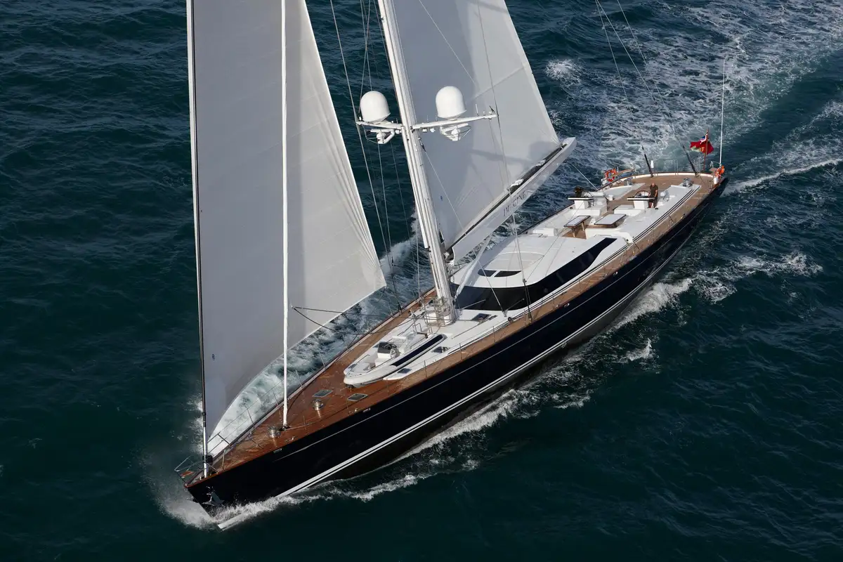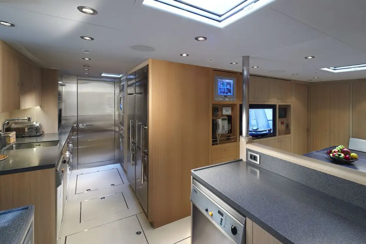 Her 3DL wardrobe is by North Sails and she has 1,011sqm (10,882sqft) of sail upwind and 1,902sqm (20,473sqft) downwind to give her sparkling all-round performance. A daggerboard gives her a draft of 6.3m (20.7ft) under sail to deliver her upwind performance and that lifts to reduce her draft to 4.2m (14.1ft) for access to shallower ports and lagoons.