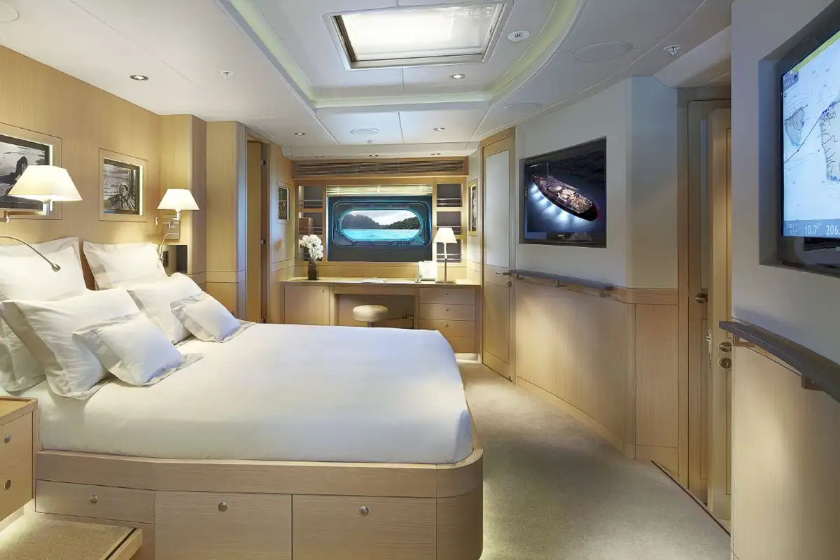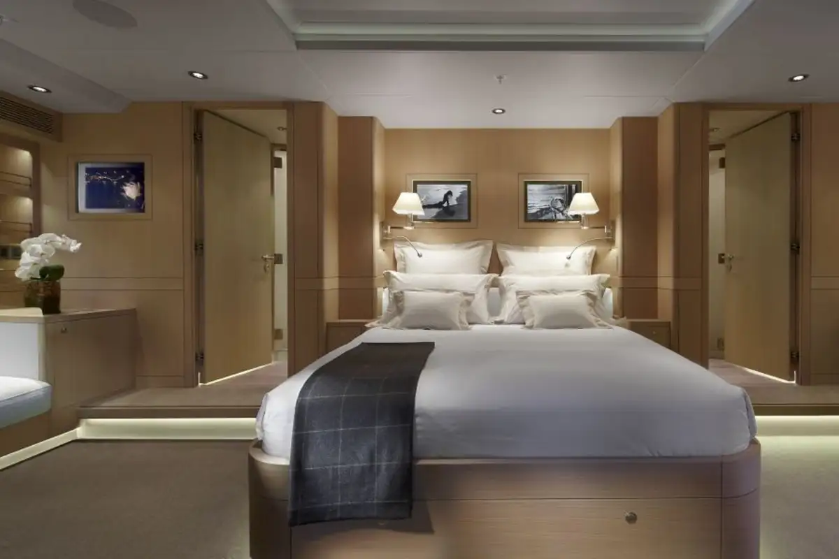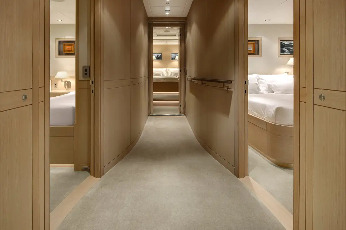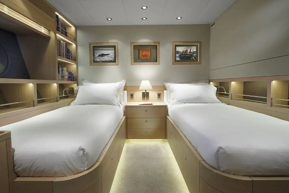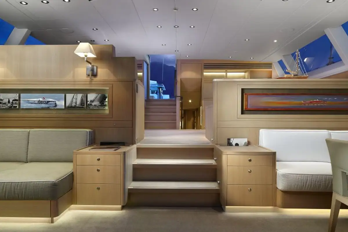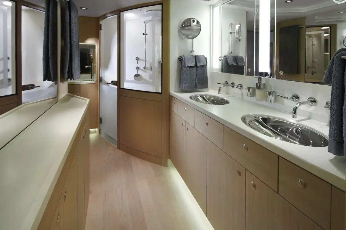 She welcomes up to eight guests. From the raised saloon, steps lead aft to three of her four guest cabins. Furthest aft is the full-beam owner's suite with a vanity table to port and seating to starboard, both with hullports, an en suite aft, walk-in wardrobe and study. There is also a double suite and a twin suite and a fourth bunk cabin forward of the lower deck saloon.