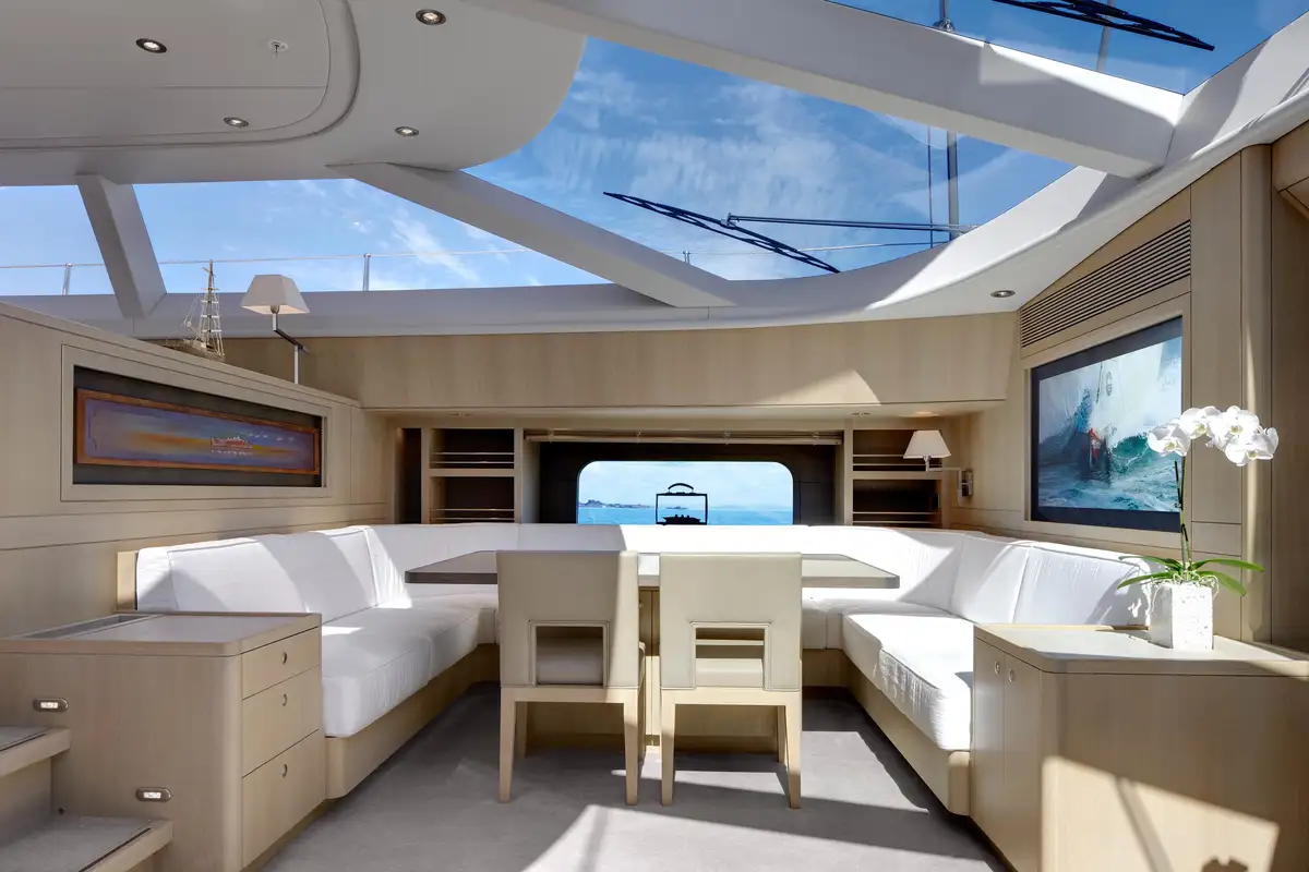 Inside there is U-shaped seating to port, an inside helm station and navigation to starboard in the raised saloon and wraparound glass delivers panoramic views. Steps forward lead down to a formal dining area to port and a lounge area to starboard, with sea level views through large hullports either side and natural light from the coachroof windows above.