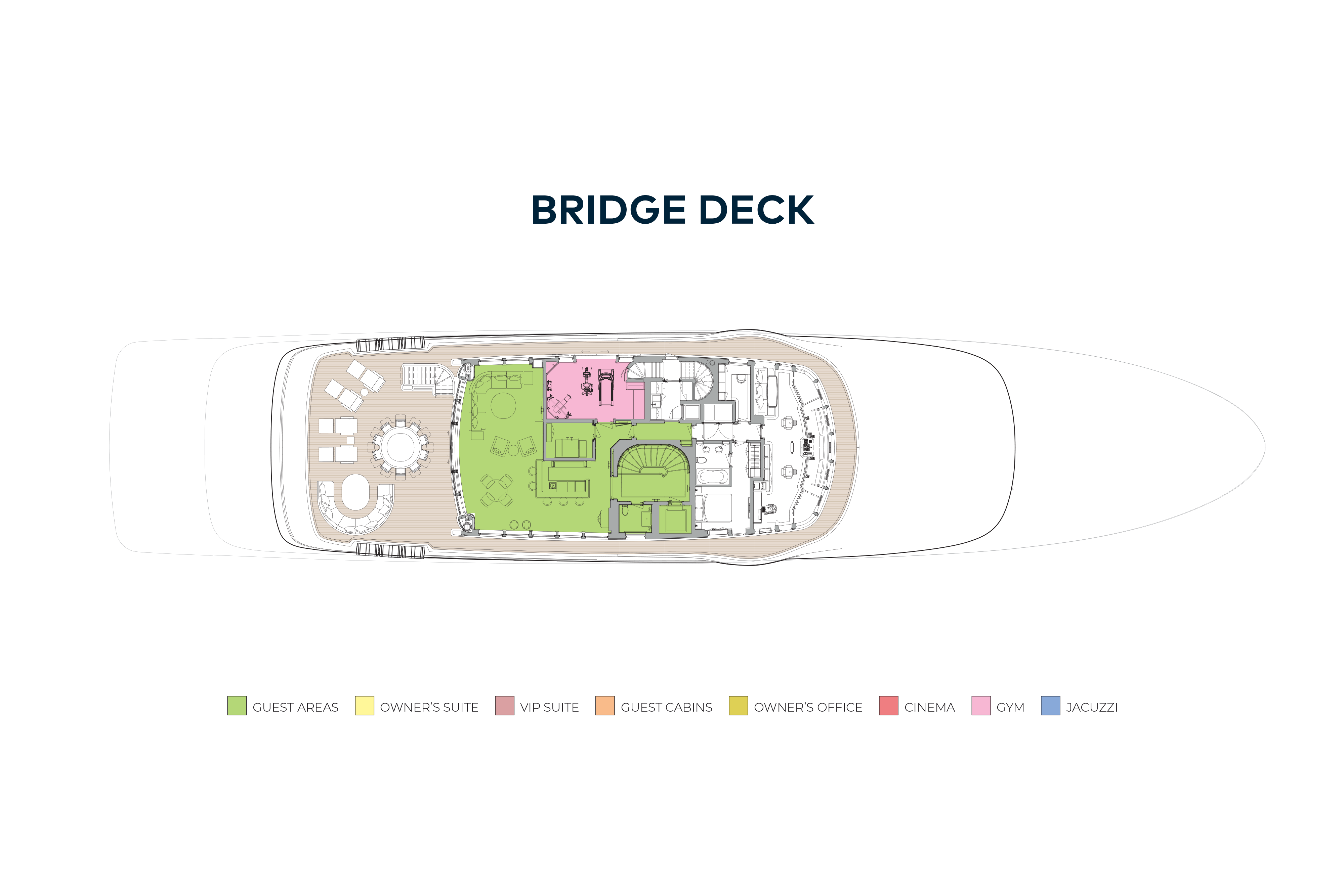 - Designated owners deck with forward facing cabin, study, his and her ensuite bathrooms, and an owners salon aft
