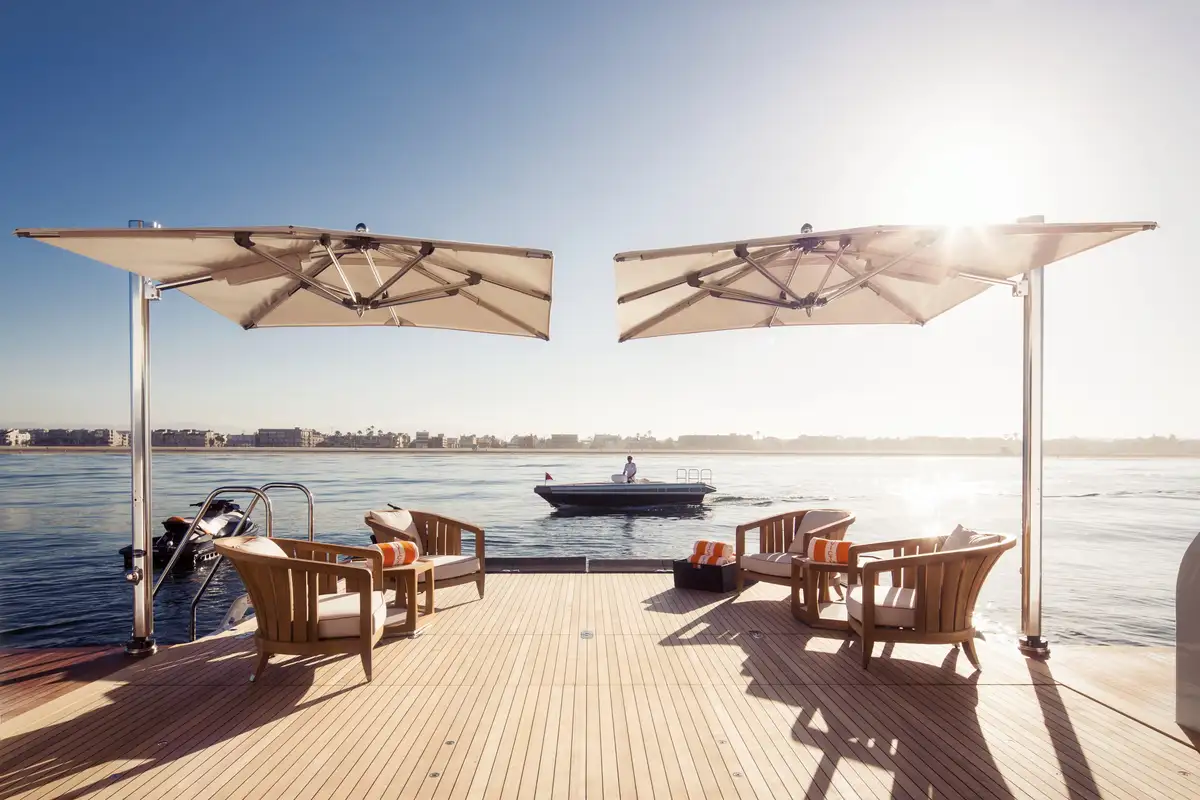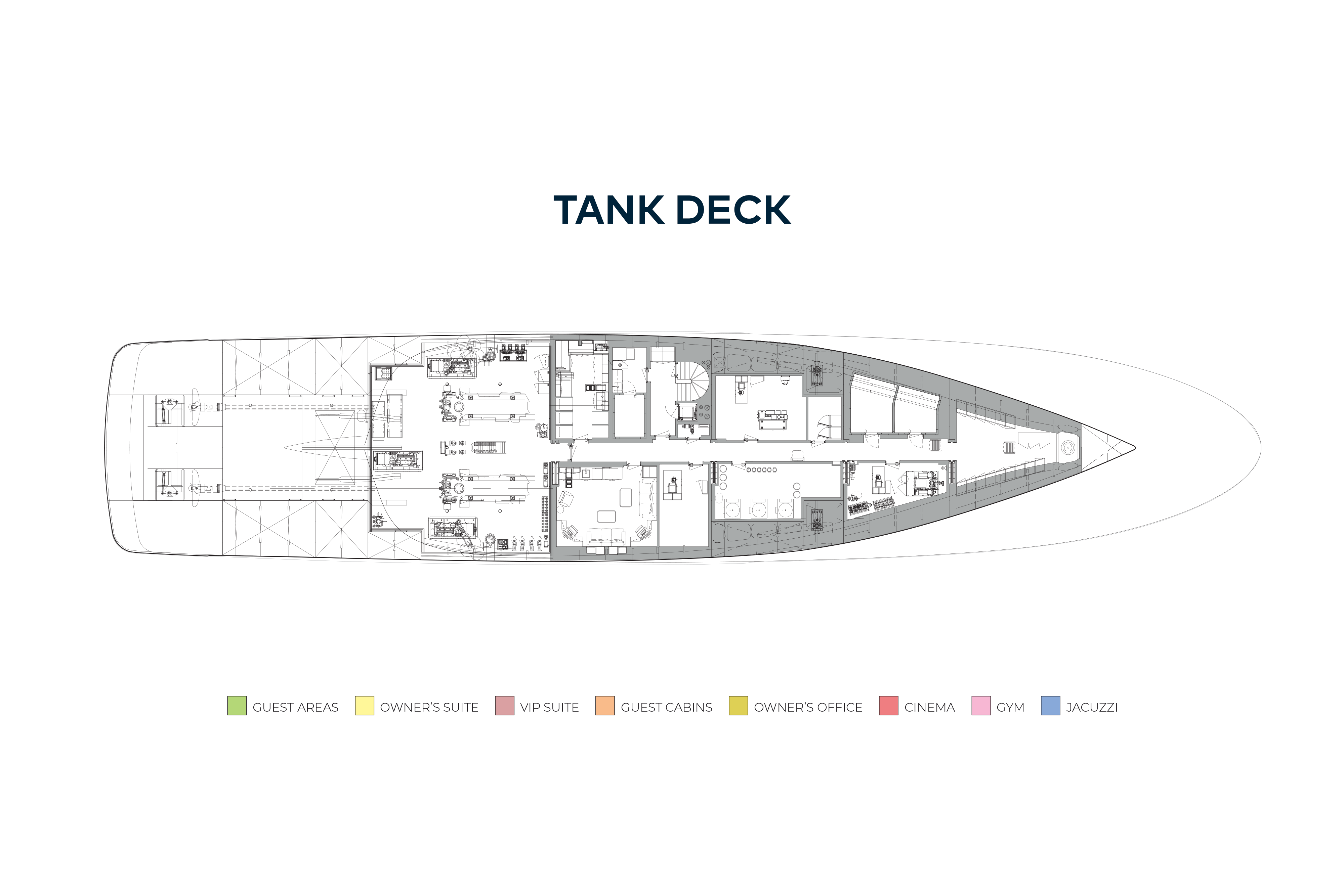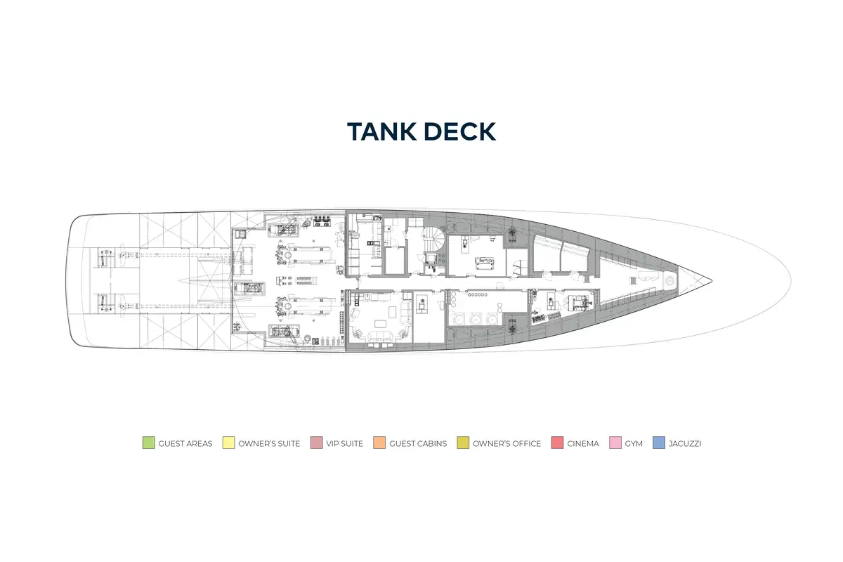 - Full beam tender garage with port and starboard access, capable of housing two 8.2m (27ft) tenders, four jet skis, and other water sports