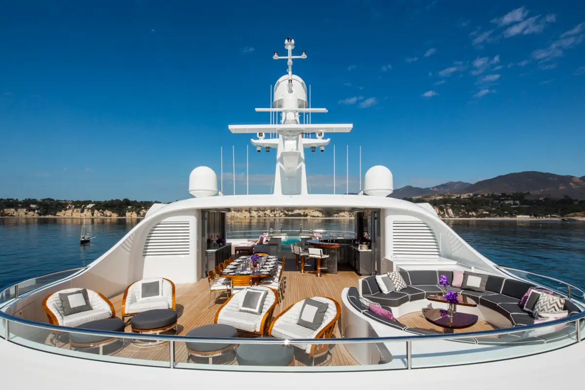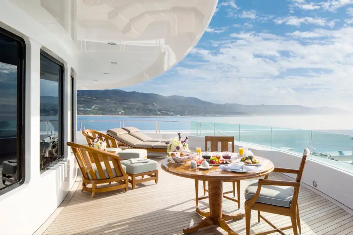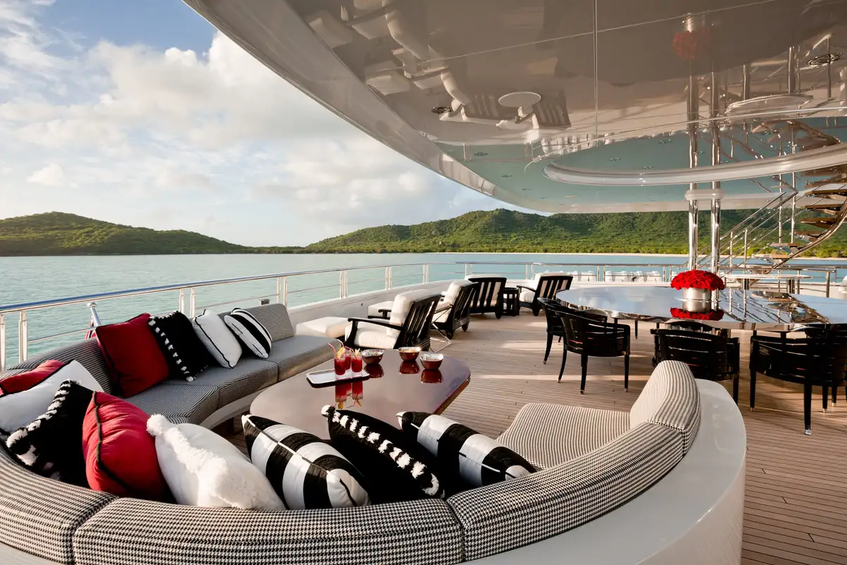 On the top deck varied seating arrangements and sunbathing areas create a relaxed lounge around the glass-fronted jacuzzi. Under the hard top is a large sit-up bar for eight people, next to the outdoor dining table. It is no surprise that this yacht has won a raft of awards and recognition from the superyacht fraternity.