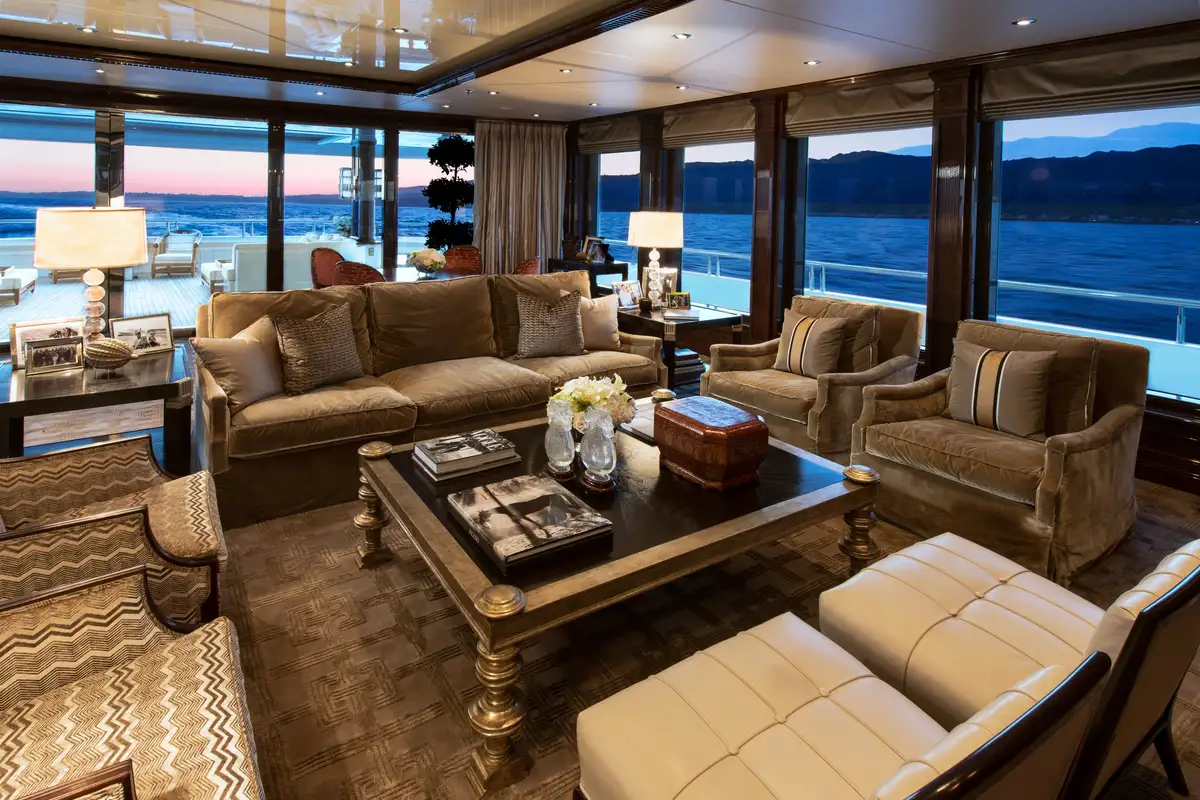At sea level the transom opens to reveal a beach club and access to the watertoys and tenders. For those wanting a more conventional workout, there is also a fully equipped gym. The full-beam tender garage with port and starboard access is capable of housing two 8.2m (27ft) tenders. INVICTUS is wheelchair accessible and has an elevator linking all interior decks. The high-ceilinged main saloon is filled with light by picture windows flanking the sides of this elegant space. Next door the cinema recreates the full experience with tiered seating for 14 people, reclining armchairs and a huge screen.
