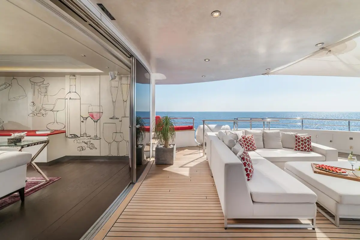 With her sleek lines and distinctive exterior profile, JOYME is one of the most instantly recognisable yachts on the water. Built in steel and aluminium with teak decks, she has vast outdoor living spaces with multiple lounge and dining areas. Her huge aft deck is ideal for al fresco meals with a large dining table and built-in ergonomic seating. The sun deck is set up as the ultimate outdoor playground with a lounge and bar area plus a 3.5m spa pool overlooking the ocean.