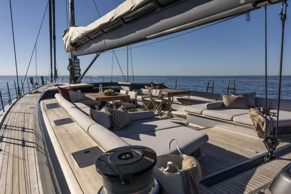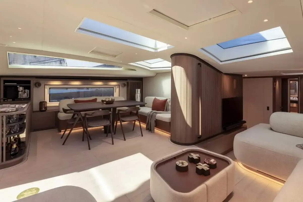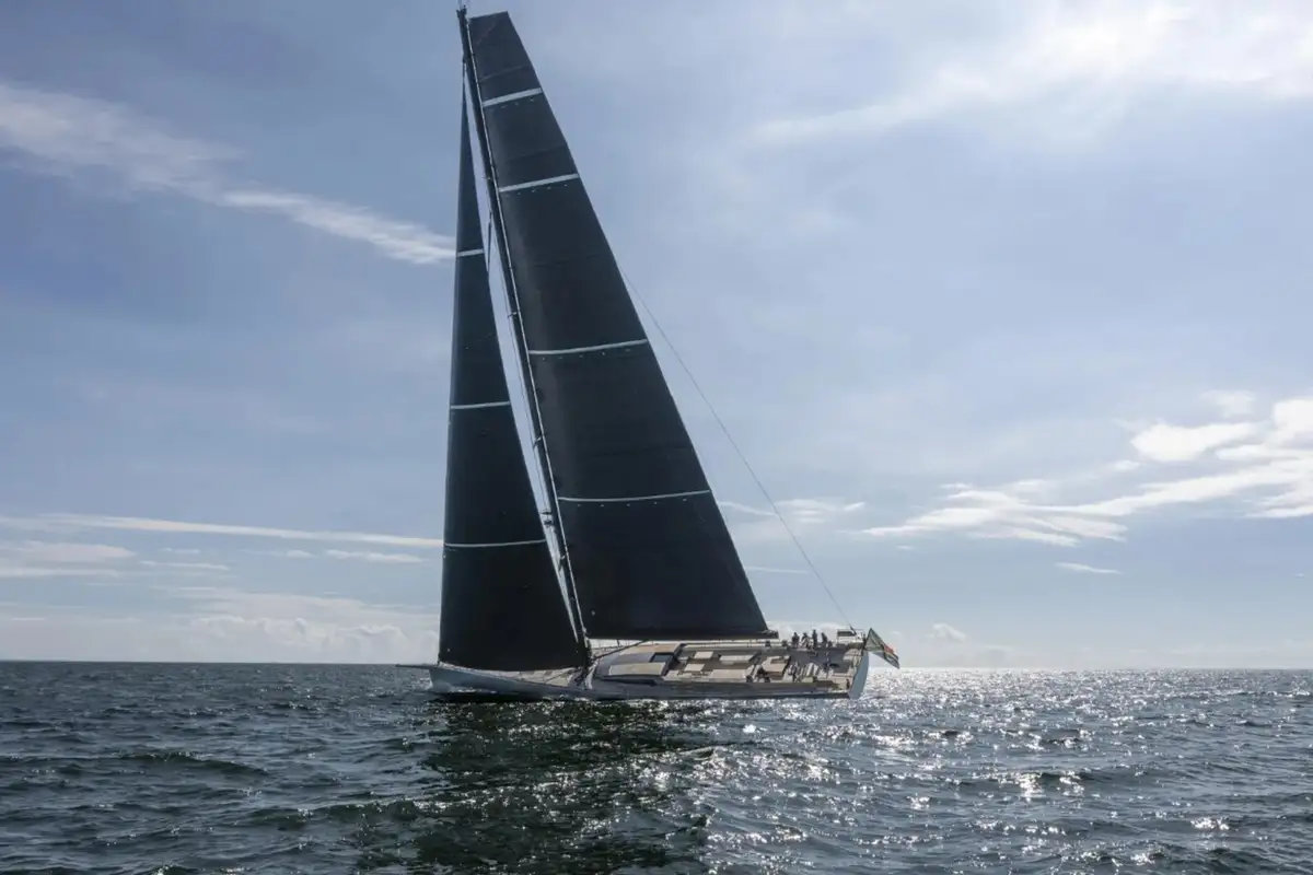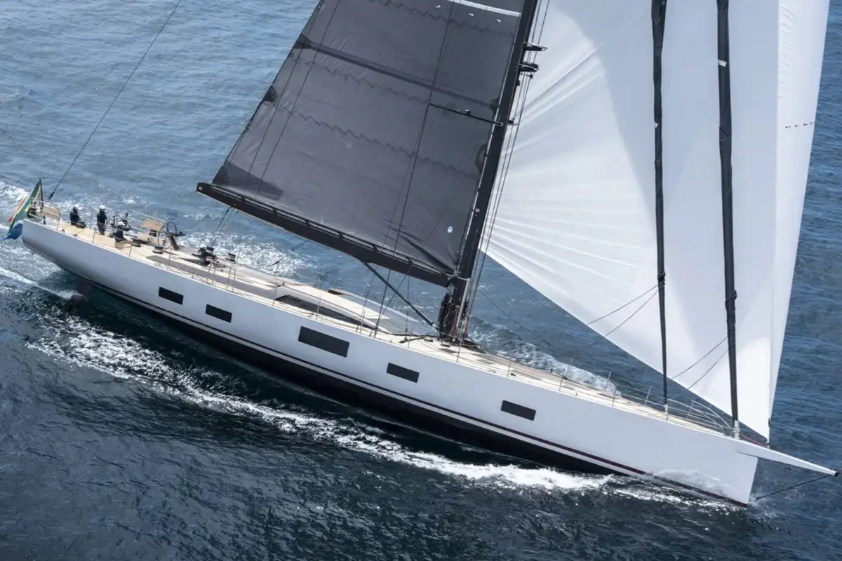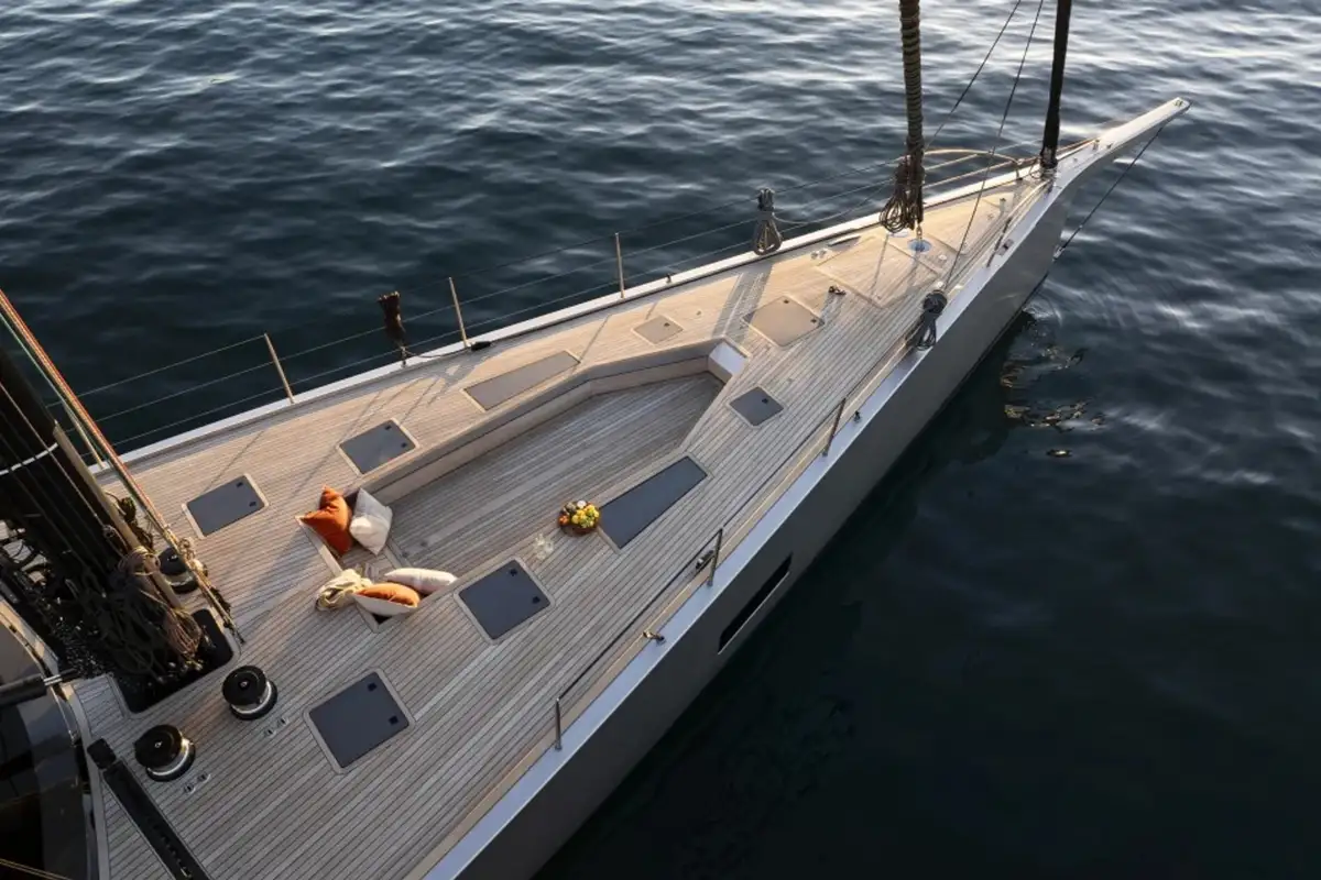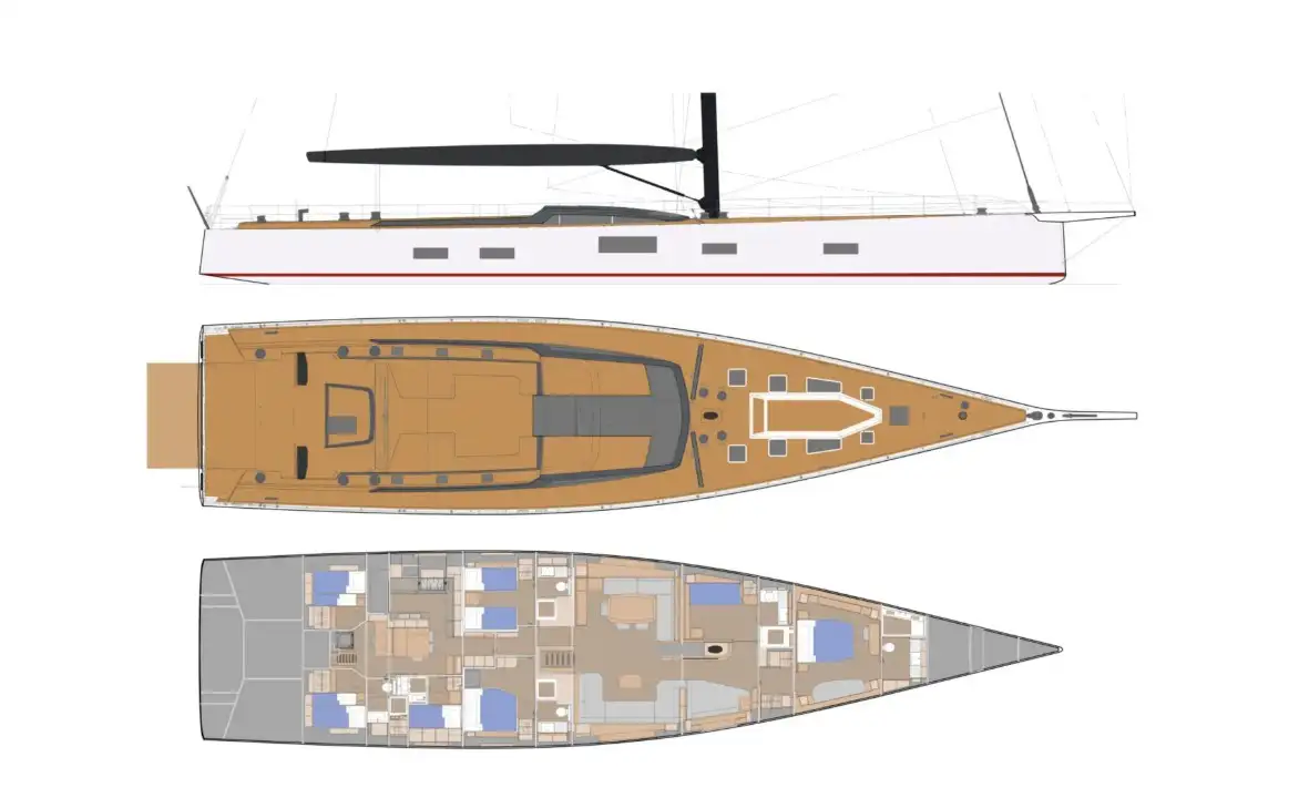 She was designed by Nauta Design, who also designed the interior. Her full carbon hull, deck, and bulkheads, along with a high modulus carbon mast and boom, a lifting keel (4-6.2m) and titanium deck fittings, offer a displacement to just 74.2 tons, making her a formidable sailing machine.