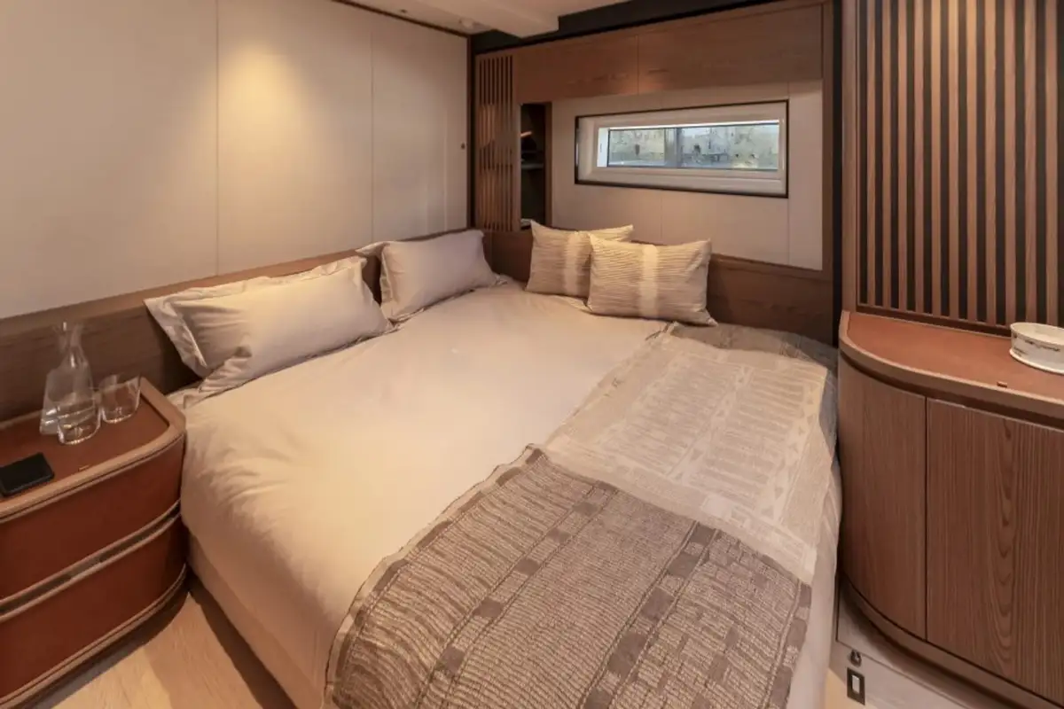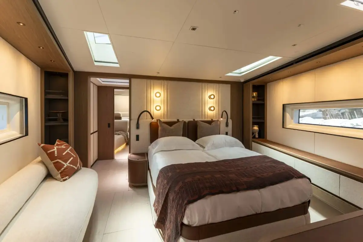 She can accommodate up to 8 guests in 4 staterooms, with 5 crew members. KALANTIS offers a four-cabin layout: the owner’s cabin is forward, in the quietest part of the yacht, with three guest cabins amidship. This arrangement allows for a spacious, L-shaped social area forward of the saloon, including living and dining areas as well as a TV lounge.