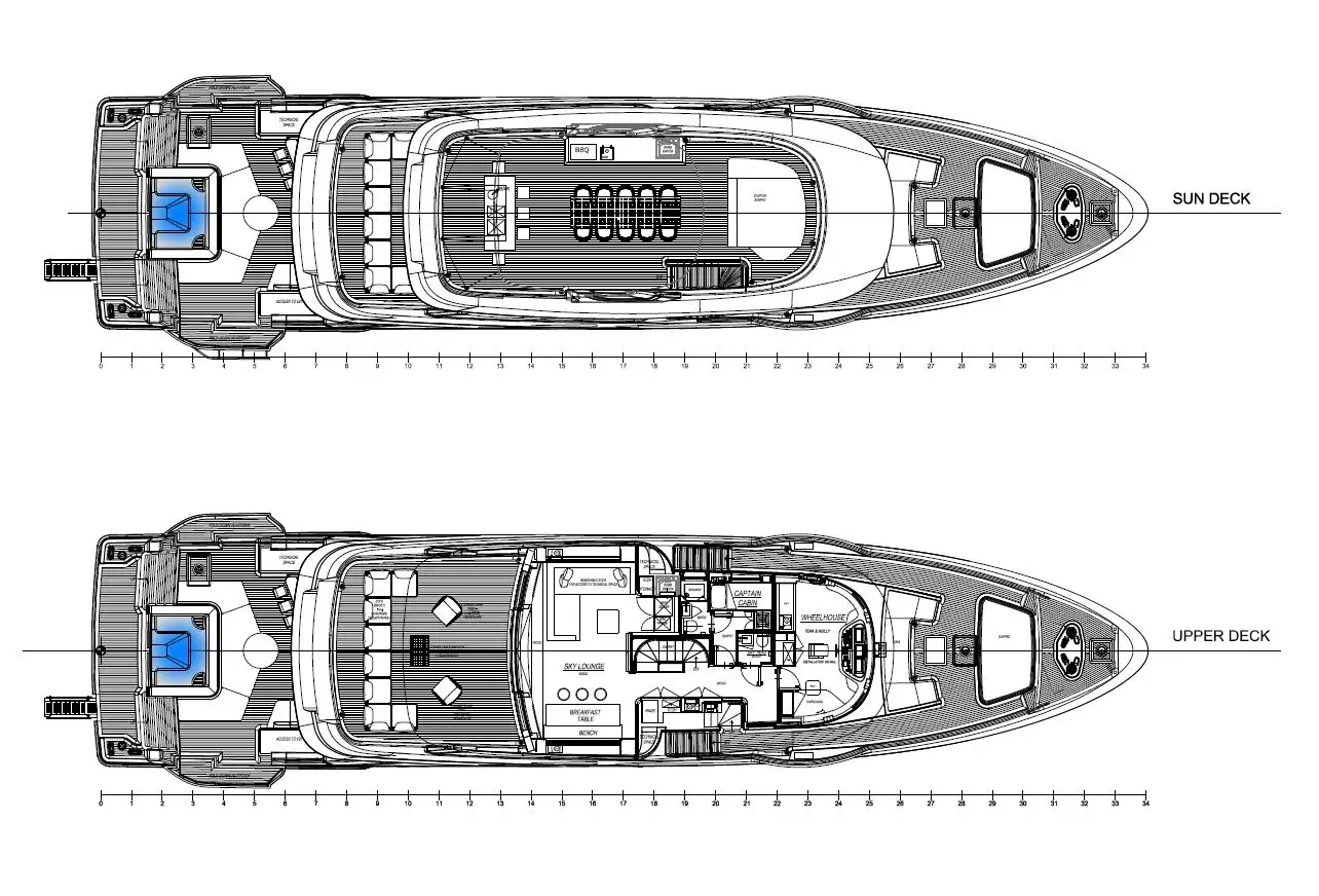 Her exterior was designed by RWD and was made for entertaining. Her main deck aft features an infinity pool, drop down balconies, full-service bar, fire pit, and ample seating. For guests who enjoy sunbathing, there are sun pads located on the stern, bow, and sun deck. KINGSāS LAIR sun deck also boasts a large al fresco dining table with seating for 10 guests, a BBQ, and an additional full-service bar.