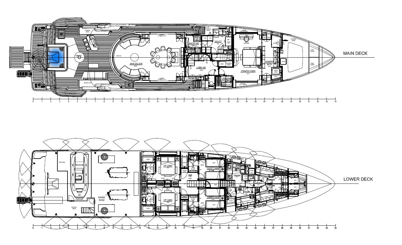 KING'S LAIR is configured to host 10 guests in five cabins. Her full-beam master cabin is located on the main deck and features oversized windows, large TV, desk, and a private en suite bathroom. Guests will find comfort in her two double cabins and two twin cabins located on the lower deck. The separate crew quarters can accommodate seven crewmembers.