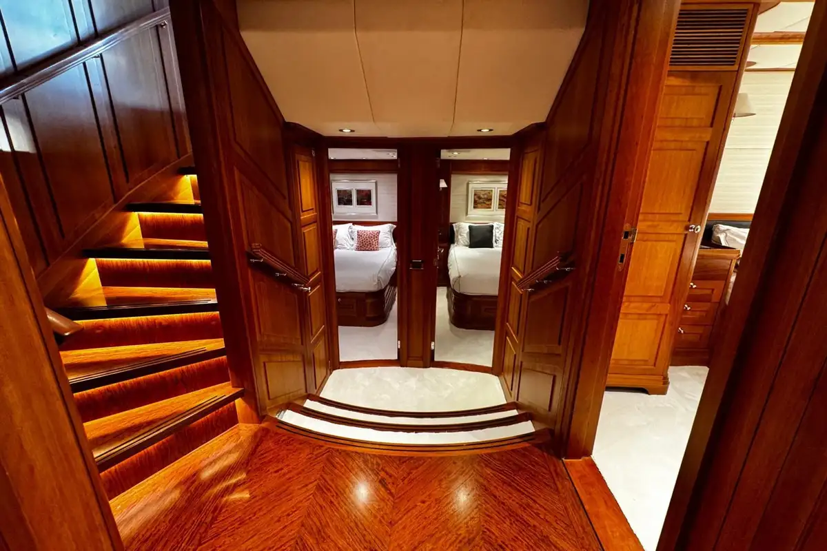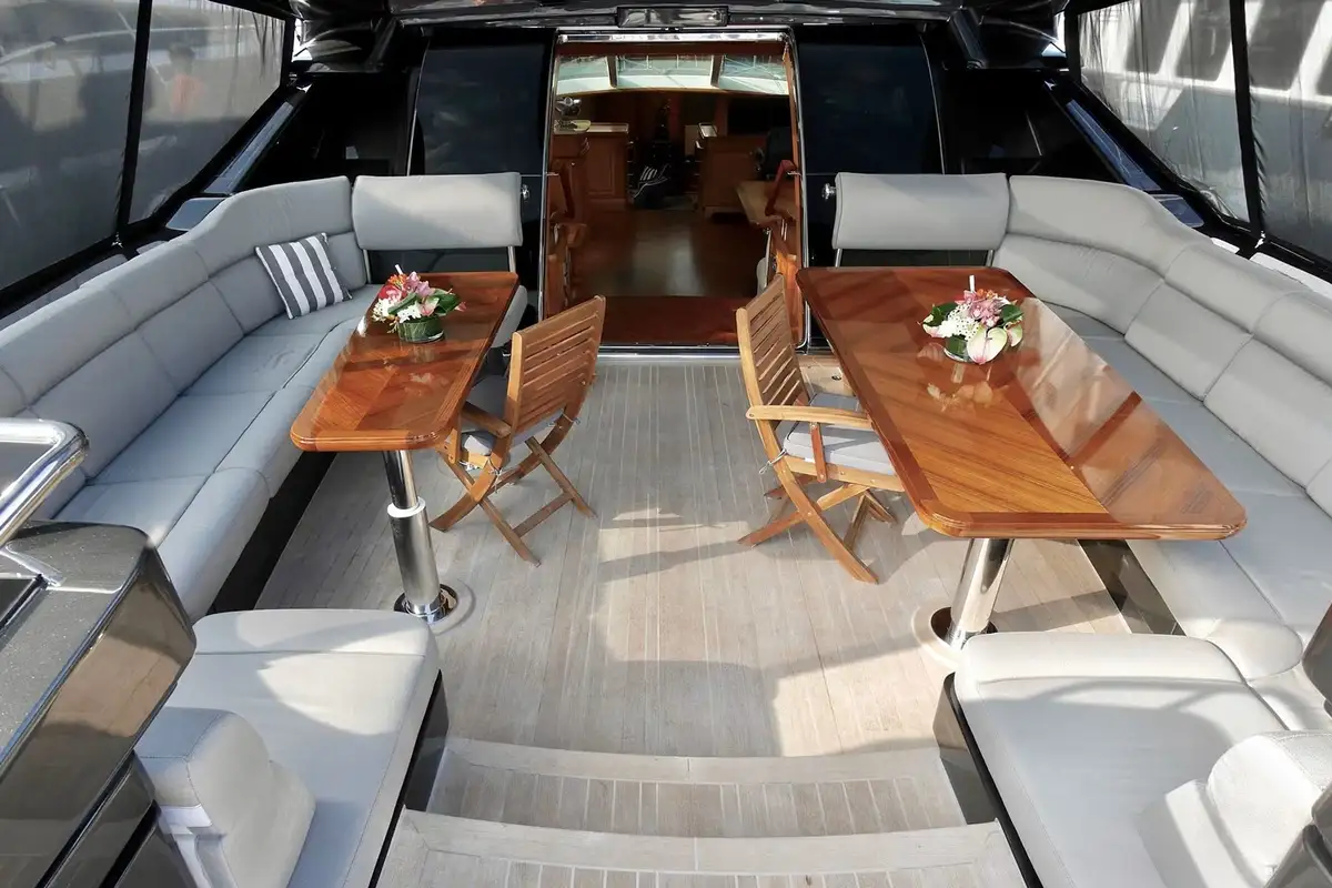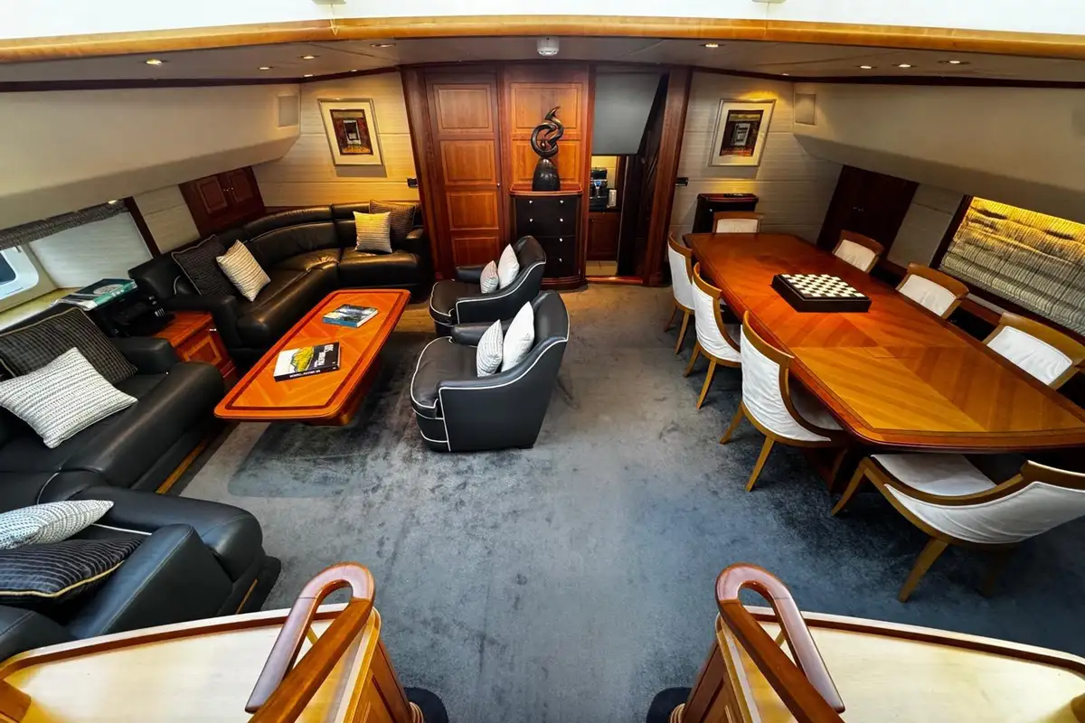 The deck salon boasts panoramic views and relaxed lounge seating, while the lower deck dining area offers a refined setting for up to nine guests. Aft, a generous covered cockpit provides an inviting space for alfresco dining, sunset cocktails, or simply enjoying the journey.